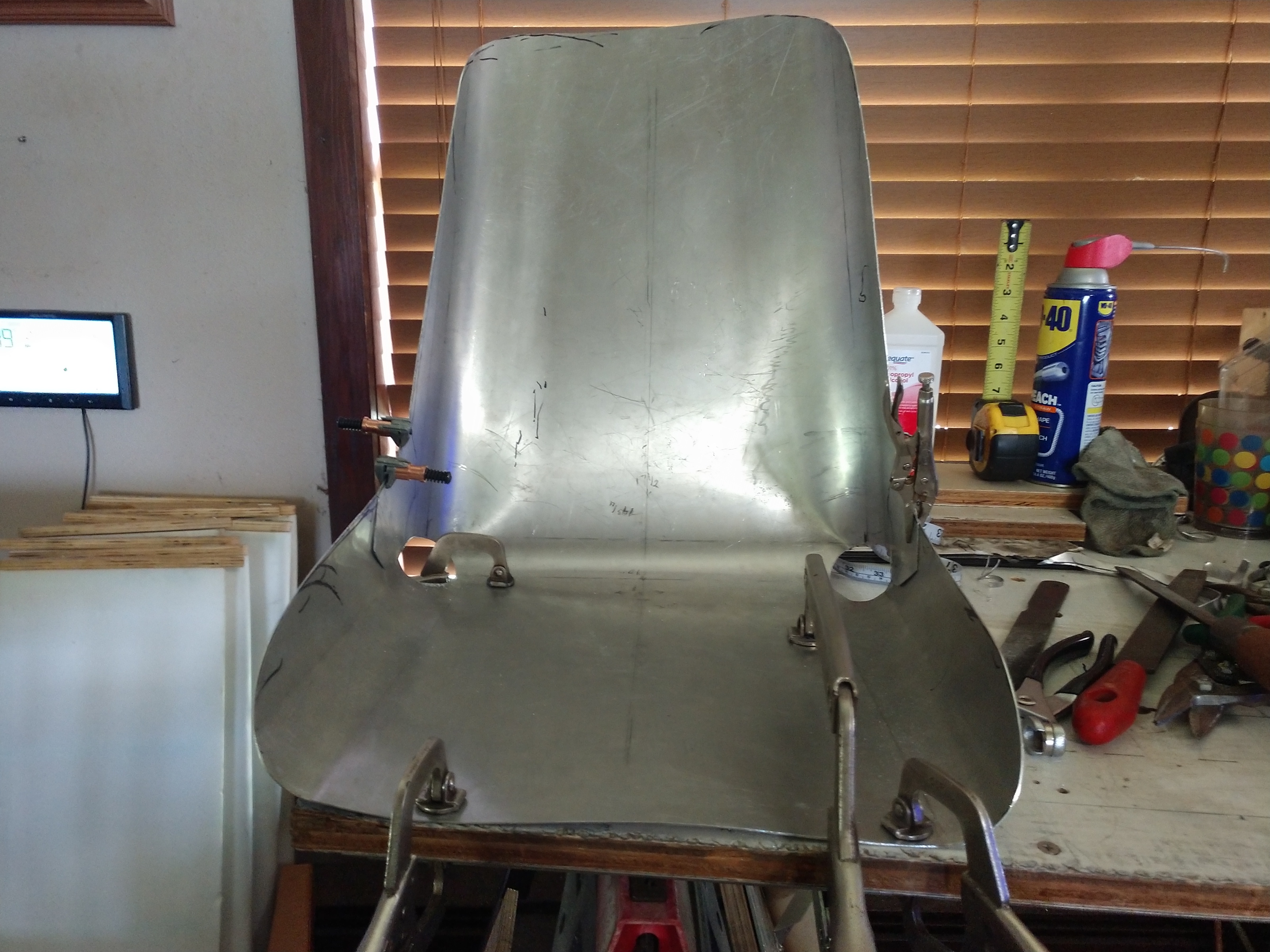 Rough shape of the "Speedster seat" going on the lawnmower. I like the proportion of it better than the previous bending of this piece of aluminum. It was way to big after trimming this seat will appear much more petite.