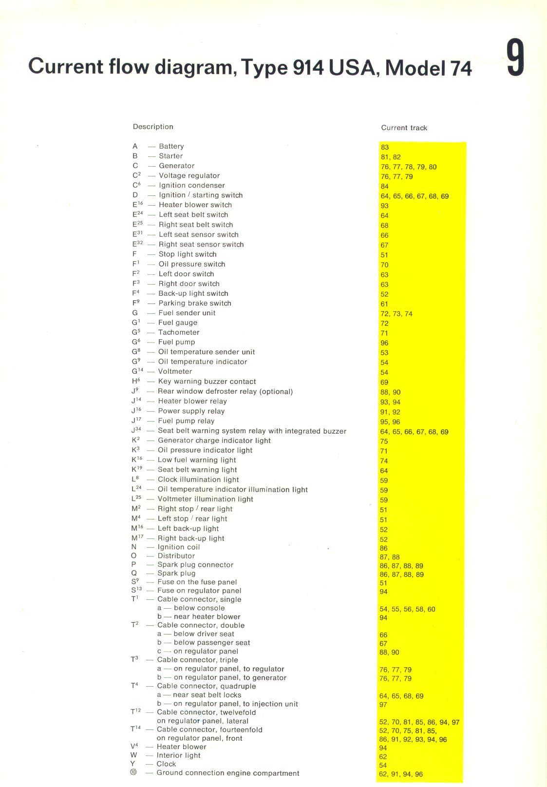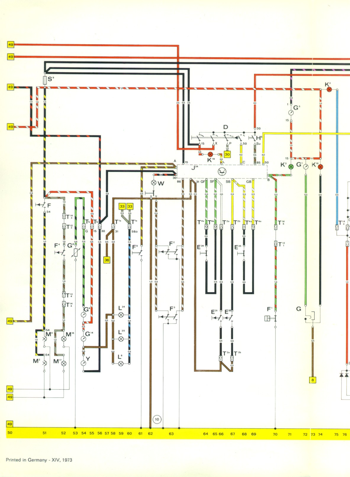 No brake lights! Resurrecting this thread and asking for help. Bulbs good Reverse lights on the same circuit work, so apparently not the fuse Just installed a new brake light switch and still no brake lights! Have not messed with anything I can think of? Electrical is my weak suit and wiring diagrams make my eyes hurt. Although I did find switch F and the brake lights on the diagram but do not understand very well what happens from there. (IMG:style_emoticons/default/idea.gif) Any suggestions appreciated. Thanks! (IMG:style_emoticons/default/white914.jpg) If you look at the attached electrical diagram and code sheet, you will see in row 51 that the brake switch is powered by the same lead that goes to your reverse lights (gray/brown stripe in row 52, M16 and M17). If your reverse lights work, you are getting power to your brake switch(F). If you are getting power to the switch but not to the brake lights, M2 and M4, I would conclude that you need a new switch. With the brake light switch depressed, check that you have power on the black/yellow stripe wire where it leaves the switch (54) to make sure it is the switch that is defective, and not a wire problem to the brake lights themselves. |