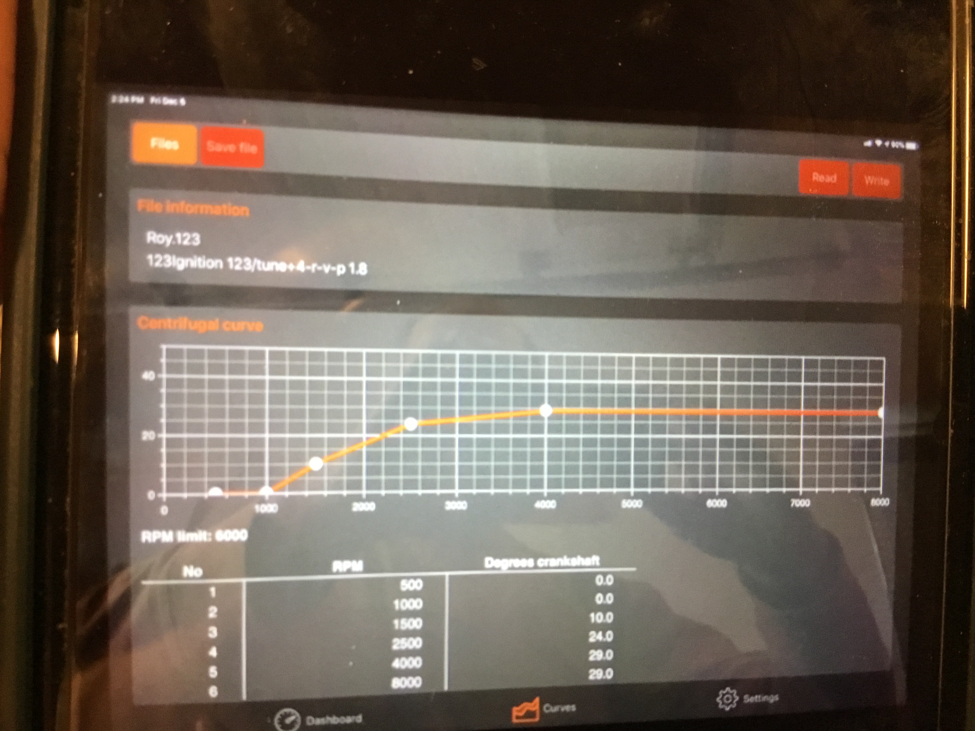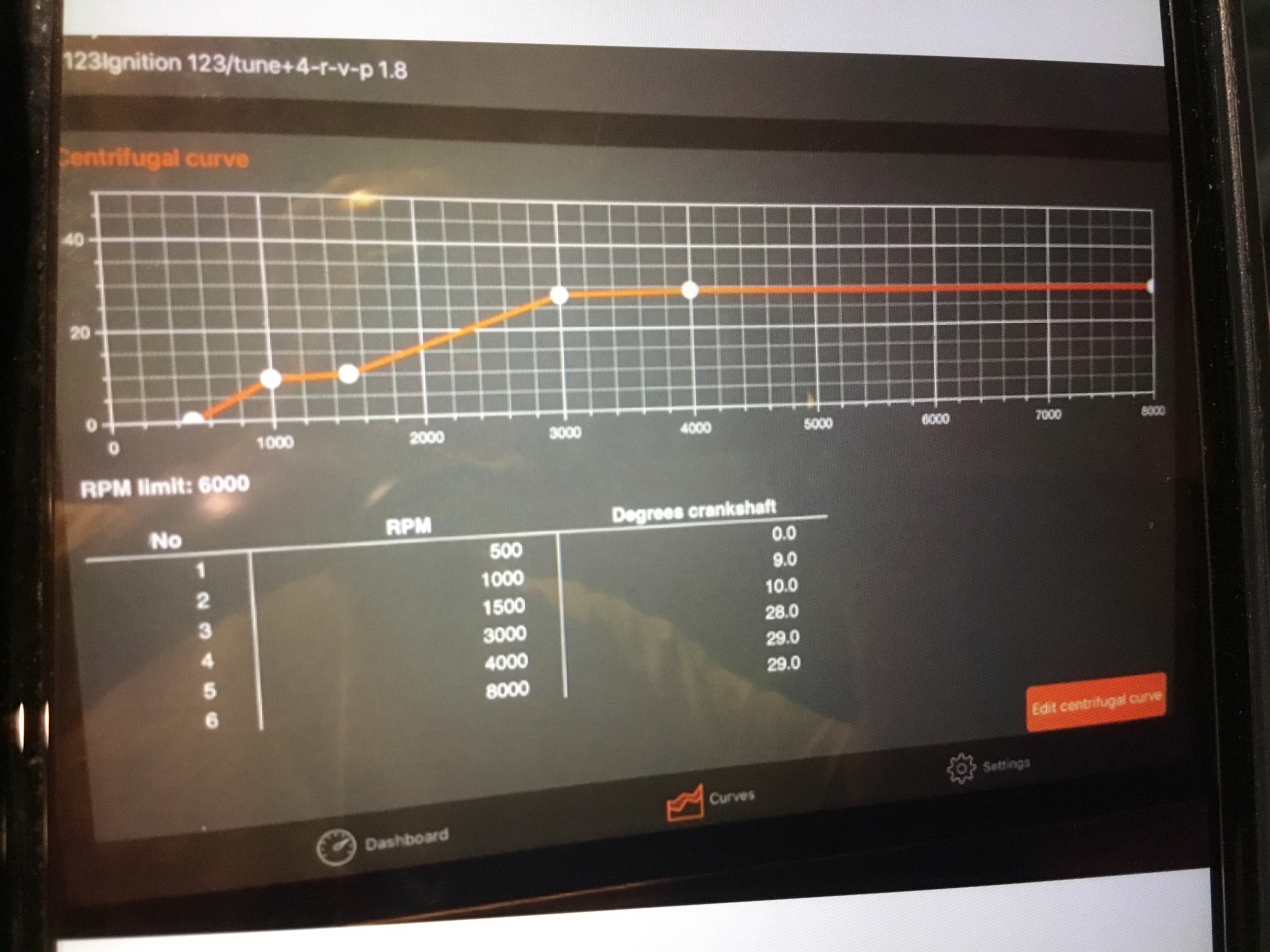 I have a 1.8 Raby 2270 with carbs, having problem getting the engine to run after installing 123Ignition with Bluetooth. After reading through the above threads I’ve the following questions: 1) Before I pulled the old 901 Dizzy/Distributor I feel comfortable I found TDC, when I reinserted the new 123 Dizzy the Rotor was not pointing in the same direction as the 901 towards the 901s #1 plug wire position! It sounds like that isn’t totally important as long as after the 123 is installed I place the plug wires in the correct position with the direction of the rotor being #1 then as follows clockwise 4-3-2 or counterclockwise 2-3-4 with the plug wires. 2) When the Bluetooth 123 version arrives it has an empty brain? Therefore one needs to program the unit to get it started/running? McMArk states earlier that 0-1000 =12 degrees and 3500-10000 = 28 degrees and vacuum advance curve is Zero 0. Which I assume I can go to the 123app and once I’ve located the green light on the Dizzy I can go into the curve screen and plug those numbers in? Thanks for any suggestions. Definately the retard curve. A 1.8 Raby 2270 ... a 901 distributor...... |