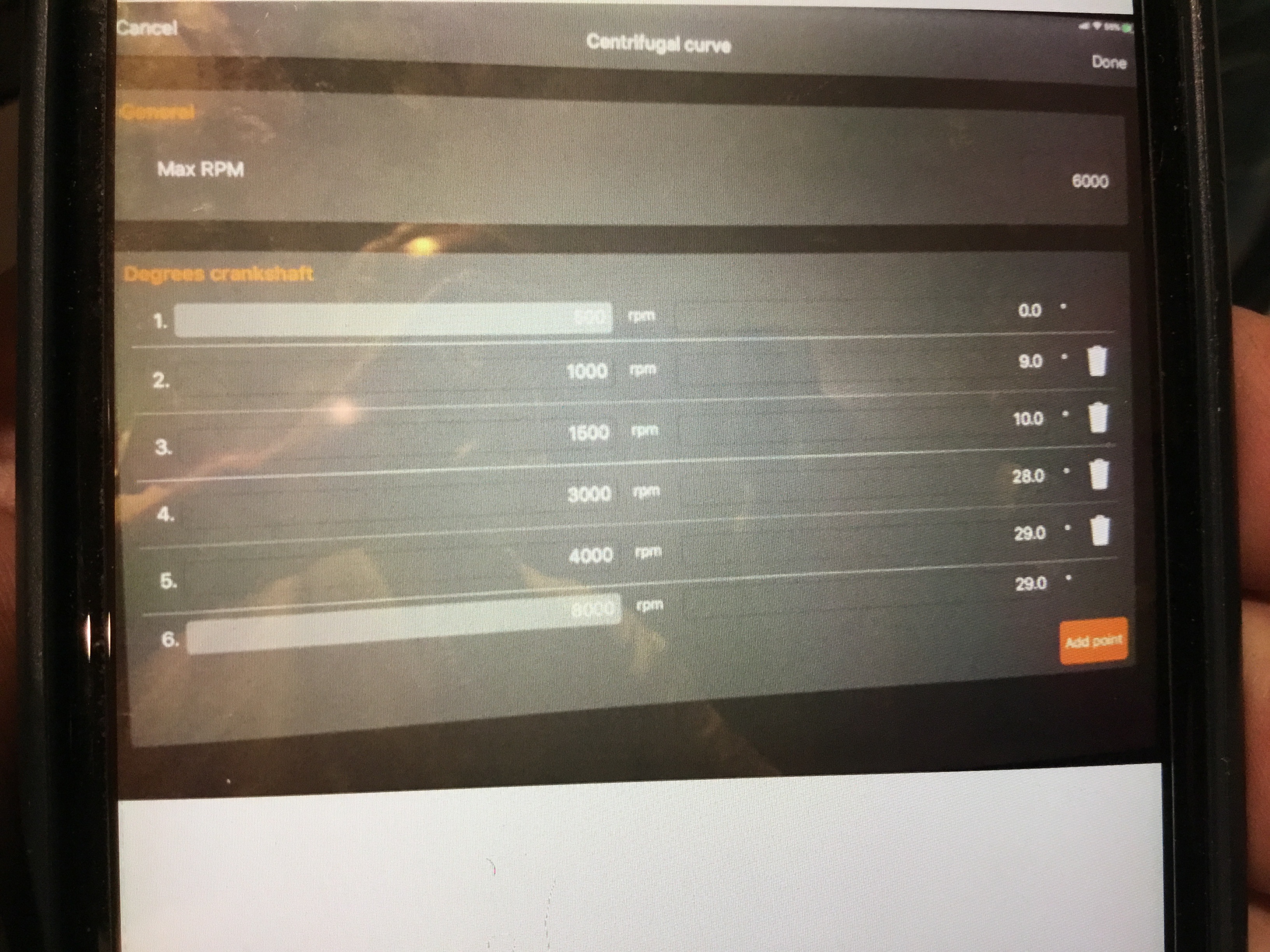 Raby is a stickler not to mess with or change his factory timing settings: From my Raby 2270 build book he shows the engine was set at Initial Advance at 9 degrees and at 3000 rpm at 28 degrees. So I went into the Centrifugal Curve settings and set them at those settings. So far so good.