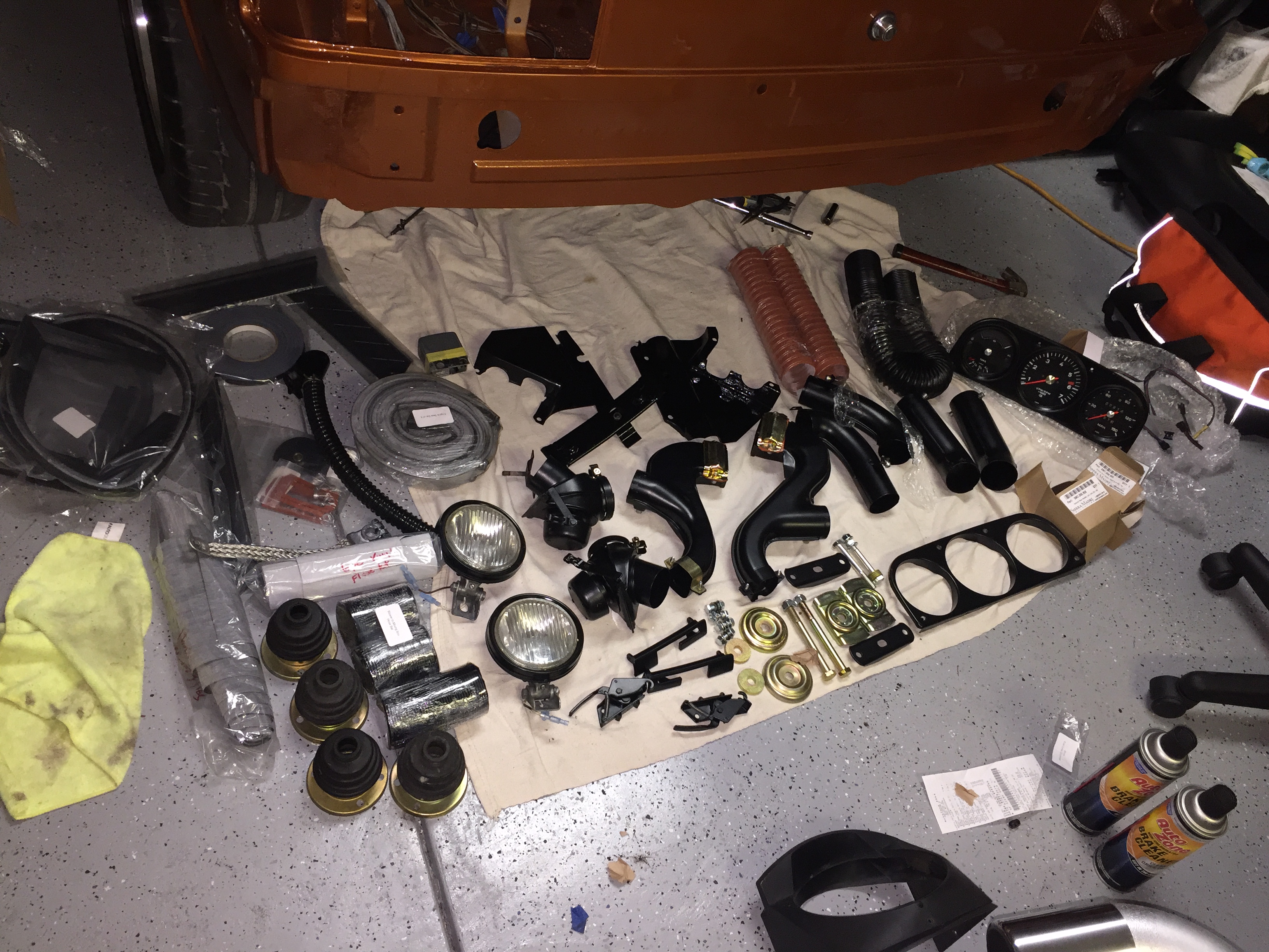 there is the LED gauge kit , the new never used outer door handles, all kinds of seals ans gromets and etc, all the heater tube parts, brackets and hinges and targa bar latches all thst black stuff and the zinc plated stuff you see are from Bruce Stone. Fuel line kit feom AA ans vac line kit too. it was overwelming me today and i didnt know quite where to start, so my friend Jim came over and we did the valve clearance then reinstalled the HE and exhaust. First time i did that myself. having someone with experience is helpful. i had 3 resources, my Tech Tips, the Haynes manual and Pelican parts tech article- this was so much easier with motor out and the HE stuff not in the way. ended up doing the pelican and Capt. Crusty’s way, pretty fast and easy. After that i pulled out the old plastic lines, and installed the stainless -that job is not done due to the small lines not lining up with the late car clips, i am still waiting dor someone that has done this to post a pic or comment on how to get them in correct position (IMG:style_emoticons/default/confused24.gif) , still fairly productive day . i had stuff in 8 different bins , and as i would order parts i tried to keep it together but i have extras from ordering stuff i forgot i had already. Attached thumbnail(s) |