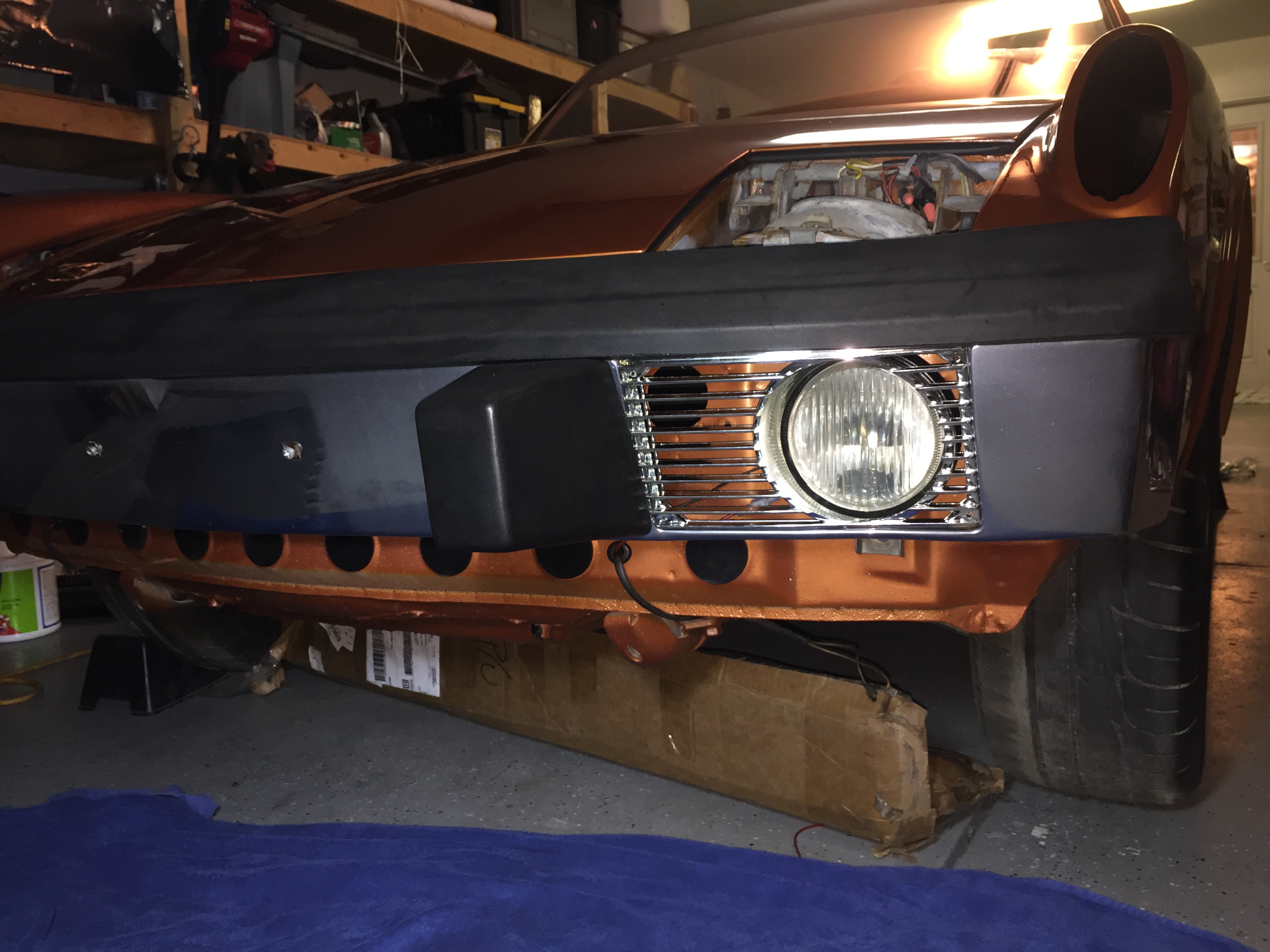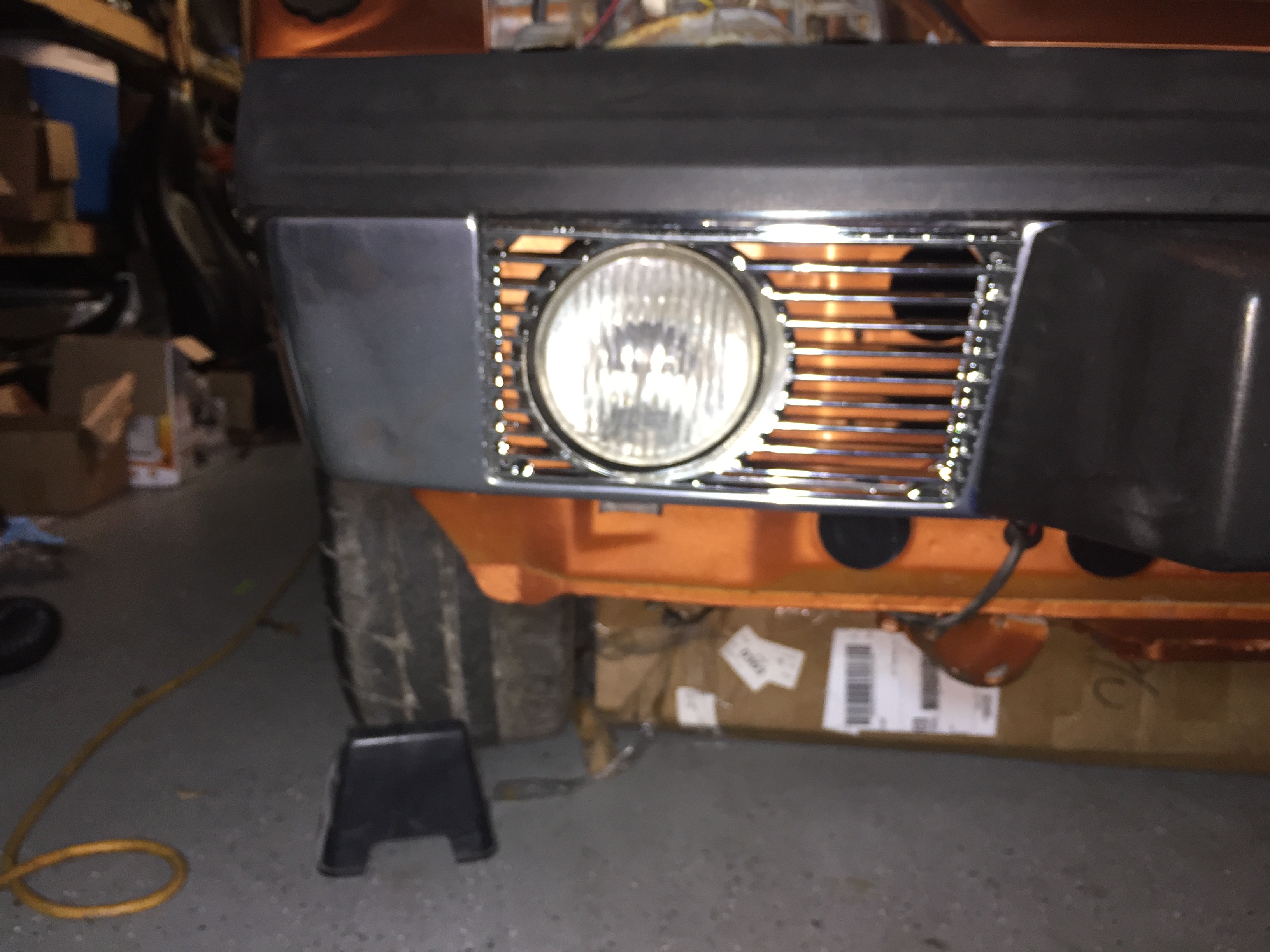 fog lights mounted today- had to do something today! had to locate where to place the mount, easy to do by mocking it up and making sure light is in the proper position and angle. i also had to modify the wiring due to the ‘75 ones usually were self grounding to the bumper. So wired, mounted and aligned. next up i have to mount the new Hela double horns. i am trying to decide if i ahould put them behind bumper sa the earlier cars had it or under where they were before with the bub’s.