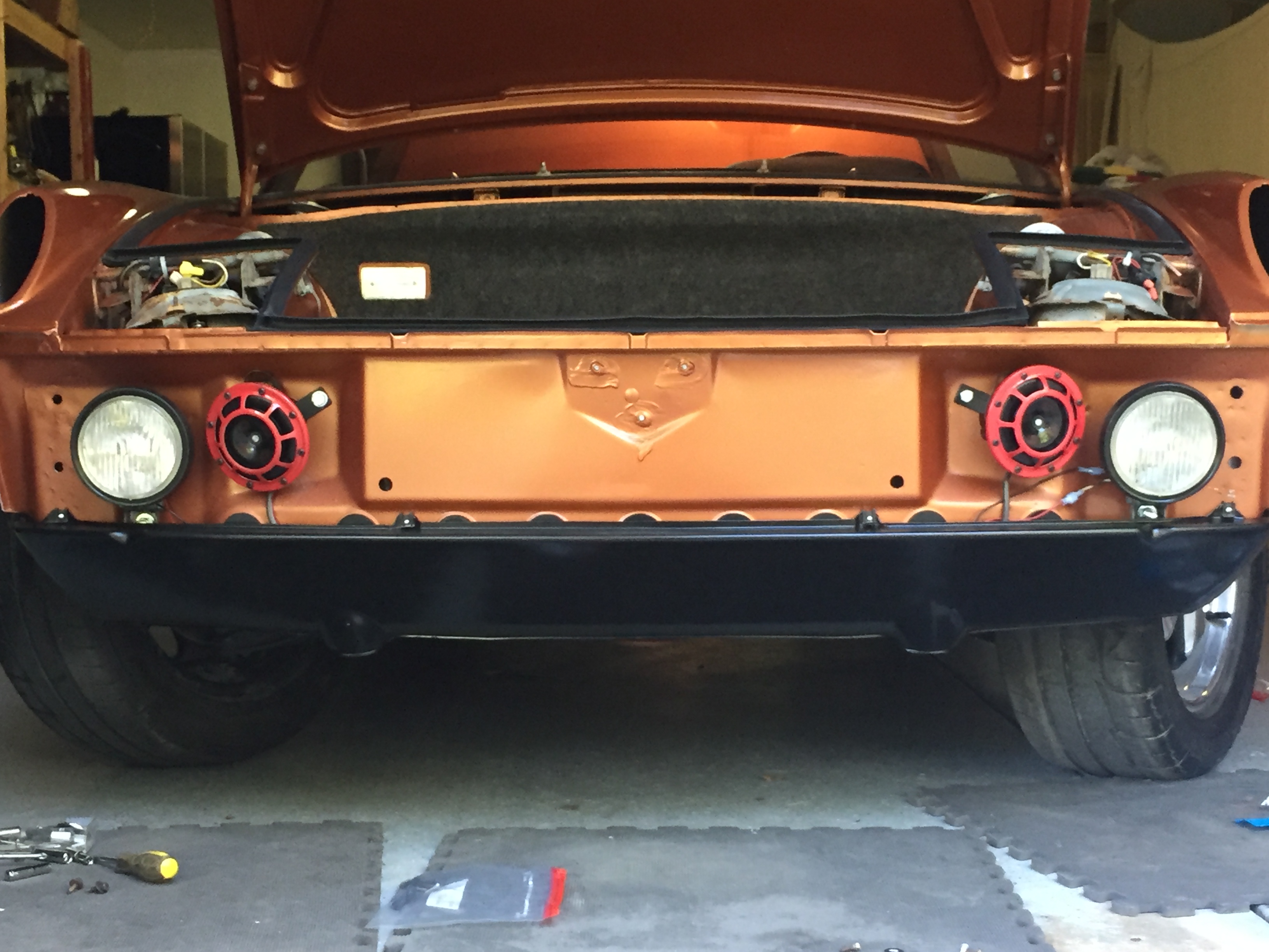 been a long day already, drove 2 hours up to the shop and picked up the car again, took it up last week to get a few things soeted and touched up. got home and went to work! the front valence is on, next is the front bumper( this is my temporary one)