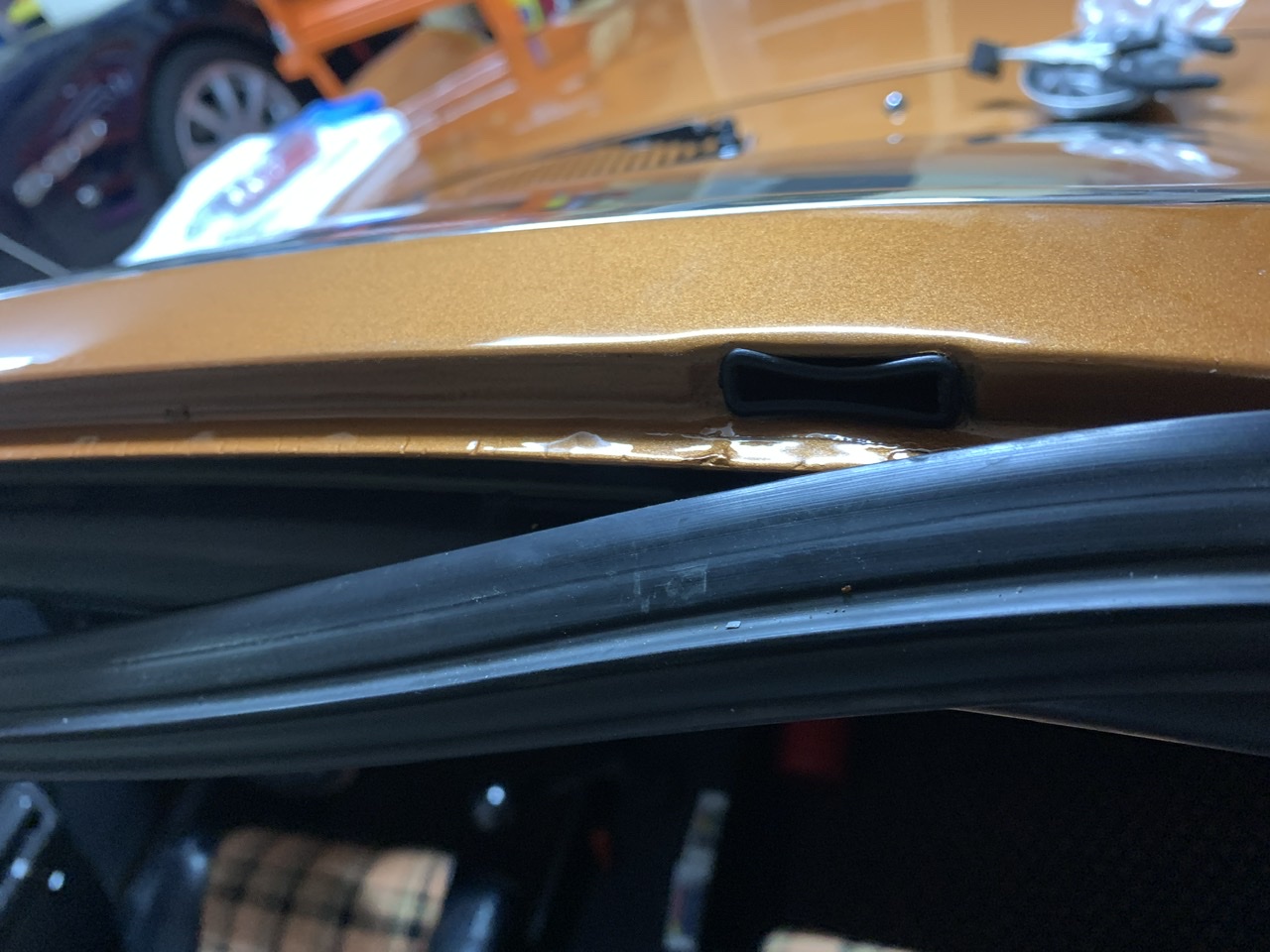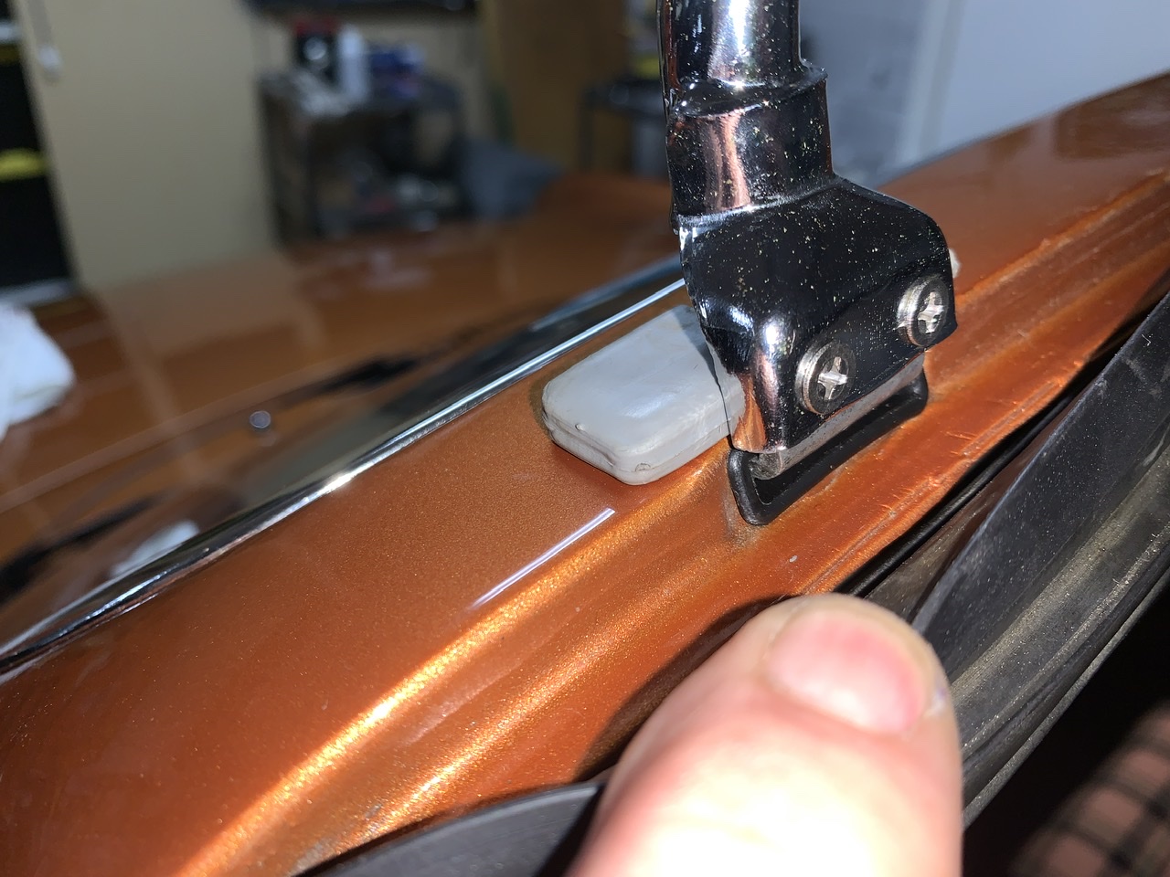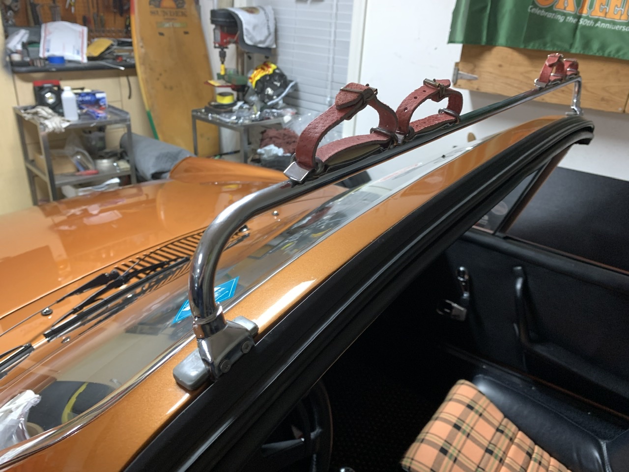 all mounted up, i believe this is how it works, the front clamps down once the bottom bracket is slid into the factory designed slot in to frame. now this pushes the seal out a bit, and i am not sure how well the top will mount with this in place, the front claps will probably have to be loosens to not pull the top too tight against the bracket, will have to see. seems that will potentially prevent the targa top from sealing tight. hm......