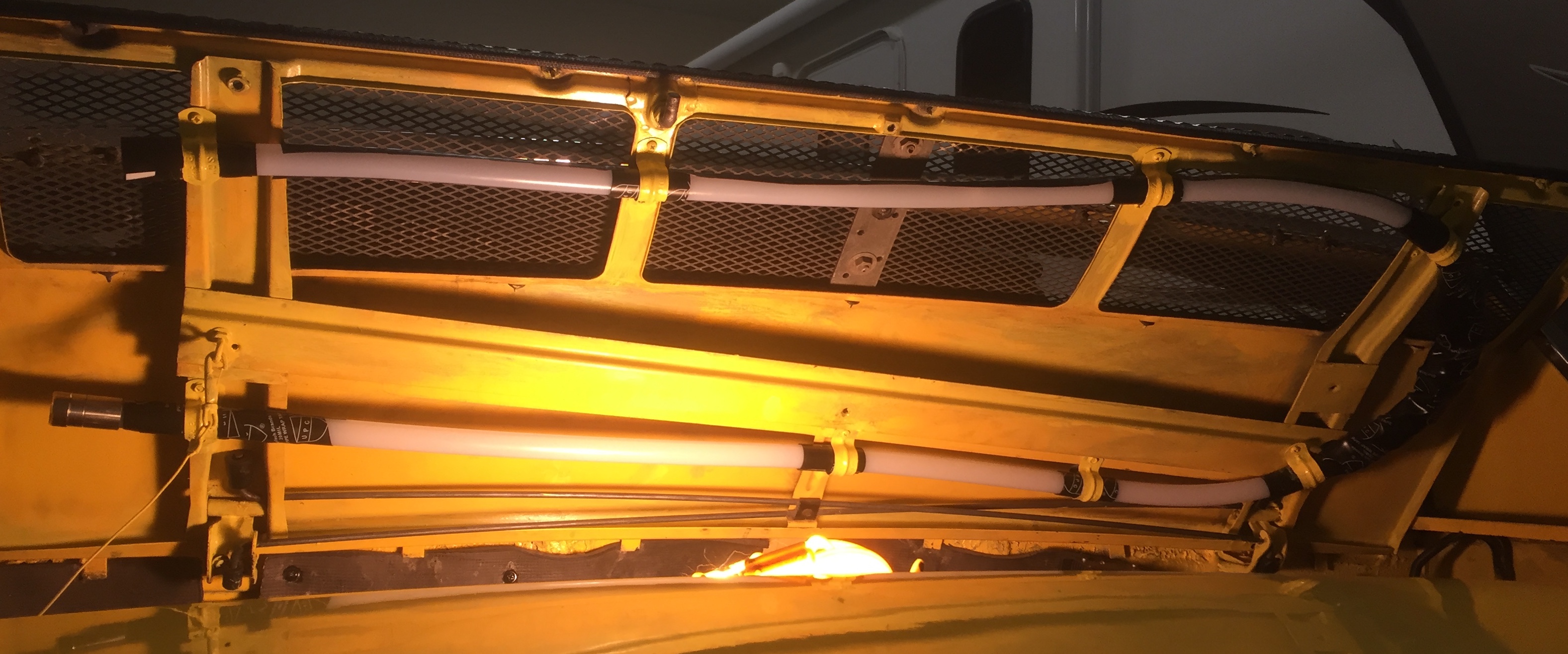 I purchased the 6 foot BlazeCut Fire Suppression System. This length only requires one length down one side of the lid, one curve, and one length back the other side of the lid. I also found that the stiff tubing does not like to bend into a tight enough arc to fit into the confines of the engine lid. The tube kinked at the center of the curve, but I don't think it damaged it. I bought an electrical gray pipe curve, 3/4" ID, split it with my band saw, and zip tied and taped it around the BlazeCut tubing at the center of the arc where the tubing wanted to kink. This supported and held the tubing, keeping the tubing in the required arc while preventing it from kinking. I also found that plastic zip ties were not strong enough to hold the tubing in position under the engine lid. The stiff BlazeCut tubing does not like to bend or go where you want it to very easily. As you can see, I removed my rain tray a while ago since I never take the car out in bad weather and the engine runs cooler without it. I fastened the tubing to the underside of the engine lid using metal pipe claps, 3/4 ID, and short self tapping metal screws into the lid supports. I wrapped the BlazeCut in heavy plumbers tape wherever it came in contact with the metal lid. I also cut thin strips of black tape and put them on the top side of the BlazeCut tube so you could not easily see the white tubing through the engine grill from the outside. If you look on the left side of my engine lid, you can also see a steel braided cable I added a while back so I don't have to hold on to the engine lid when I open it. Without the cable, if you popped the engine lid and didn't hold it, it would fly open and put a lot of bending force on the hinges, which I have already rewelded once. Now the cable catches it before it works on the hinges. BTW, if you have a weak opening engine cover, here's a link to an easy and simple fix that lets you put more pop in the opening, especially with the extra weight of the BlazeCut under the lid. My lids pops open fully now, even with the tubing under it. I hope I never have to find out how well the BlazeCut tubing works! Here's a follow up post you might want to read! I've owned my '76 teener for about twenty years. I recently installed BlazeCut in the engine compartment to hopefully stop any potential engine fire. I took the car out for a short test ride soon after completing the BlazeCut install. As I was headed back toward home, suddenly thick black smoke started pouring out from under the dash in front of my left leg! I quickly pulled over and shut the car down before a fire started. After the smoke stopped and my heart slowed down, I lowered the relay panel and here's what I saw! After forty years, one of the of the relay bases somehow short circuited internally and melted the surrounding rubber. I finally got the car home and repaired the melted relay base and all is good now. But I remember what I was thinking when I first saw all that black smoke coming from under the dash. "Great, I have a fire suppression system mounted right behind my back, and the car is going to burn up in front of me in the passenger compartment and there's nothing I can do about it!". I now carry a small fire extinguisher in my custom home made center console box, just in case the fire isn't in the engine compartment! |