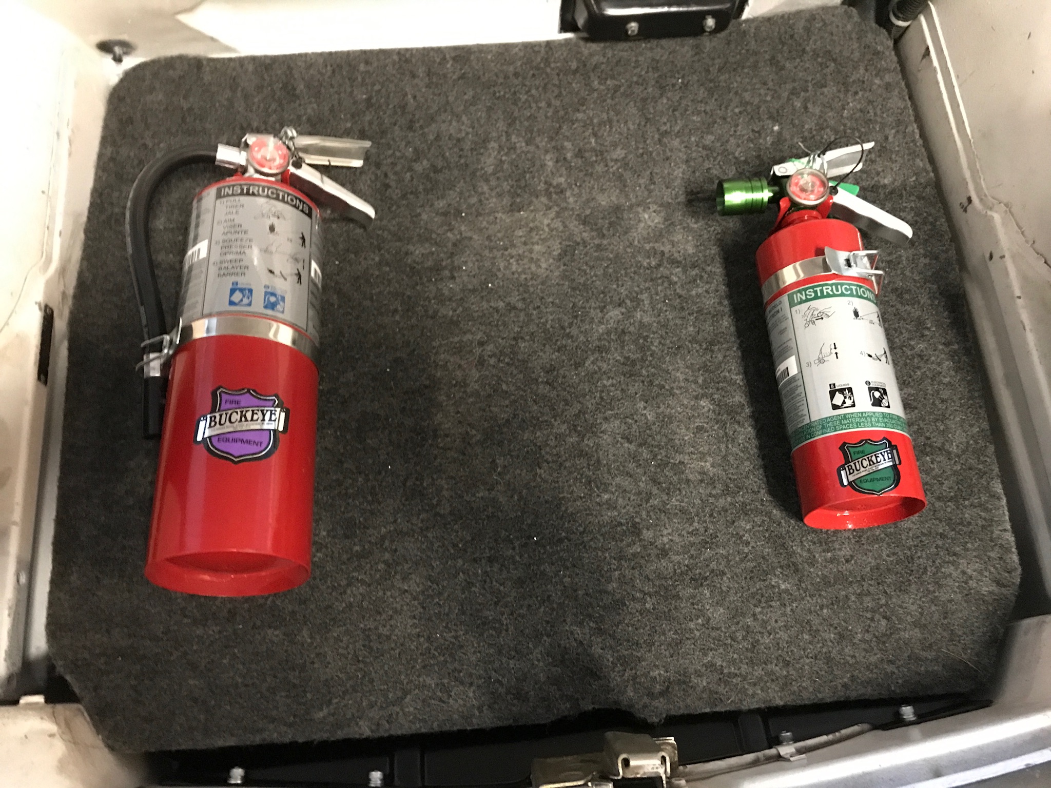 Just my opinion from 30 plus years as a career Firefighter. # Those small plastic tip Fire Extinguishers are junk # They don’t put out much of a Fire # The dry chemical Fire Ext can damage your Elec systems # The bigger the better I mounted my Ext in the front truck because you want to separate yourself as quickly as possible from a rear engine fire and you can mount a larger Ext. The extinguishers I have are a Purple K “great for fuel and metal fires” and a Halotron which is a replacement for Halon “great for Elec fires”. You can find these on Amazon. Trust me you want a larger Fire Extinguisher, those little ones shoot there load in seconds (IMG:style_emoticons/default/blink.gif) and then your screwed when the fire flashes back. You put big money in your car so spend a little more for Fire Protection. And yes I know if I am in a front end crash I am screwed. Coondog, Is that a 10 Lb and a 5 Lb? I like the set up, from this I think I will be changing my set up and follow your lead. I had a fire years ago and I don't want another one. |