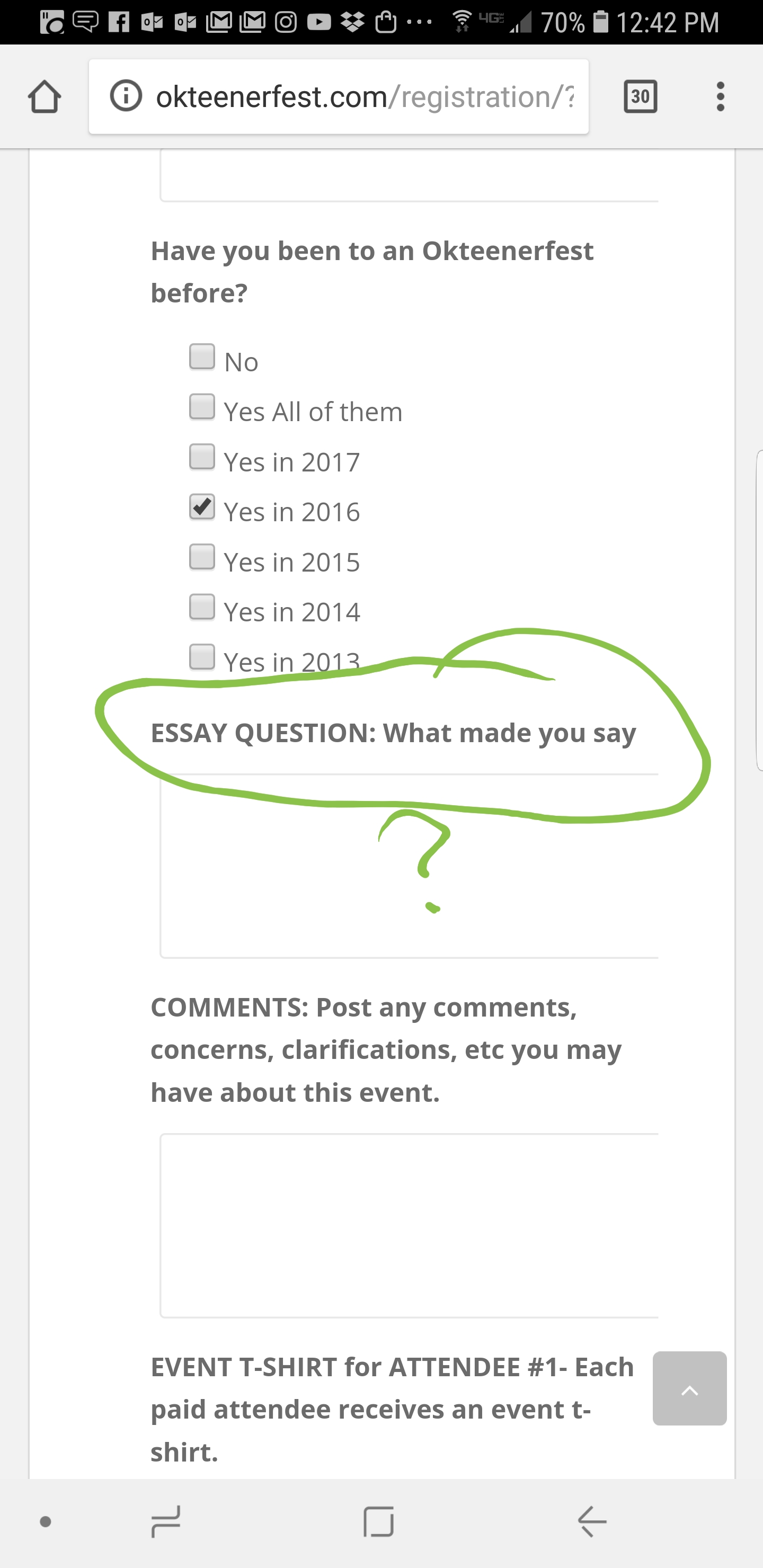Started registering, got to the essay portion (IMG:style_emoticons/default/WTF.gif) Hmmmm.... (IMG:style_emoticons/default/idea.gif) The text should read: What made you say "Oh, I gotta go to this event"? I think the quotation mark somehow caused the rest of the text to not be shown. I have added it back... let's see how long it stays. (IMG:style_emoticons/default/driving.gif) |