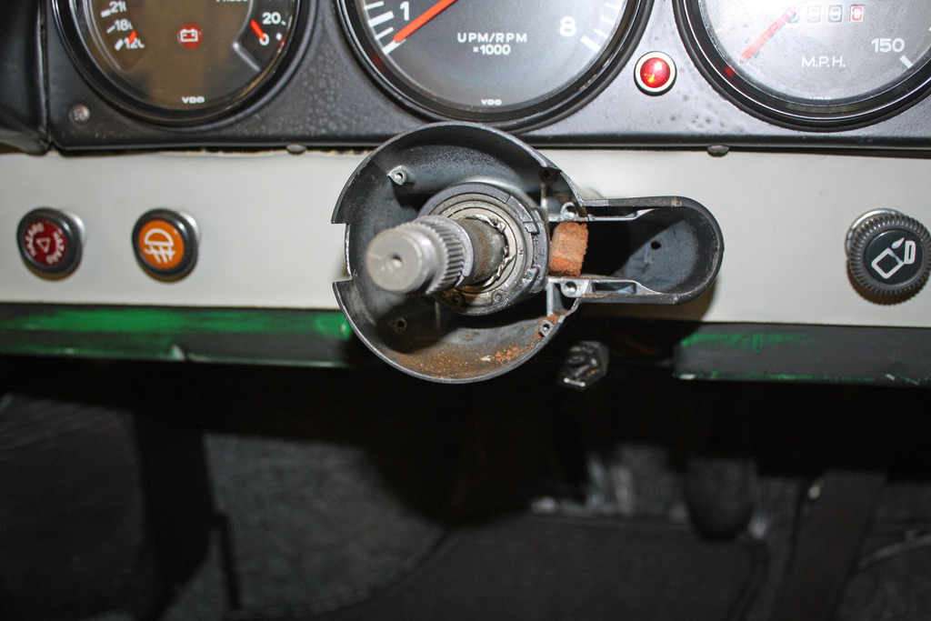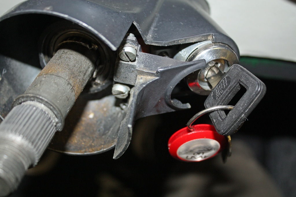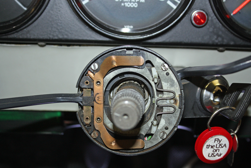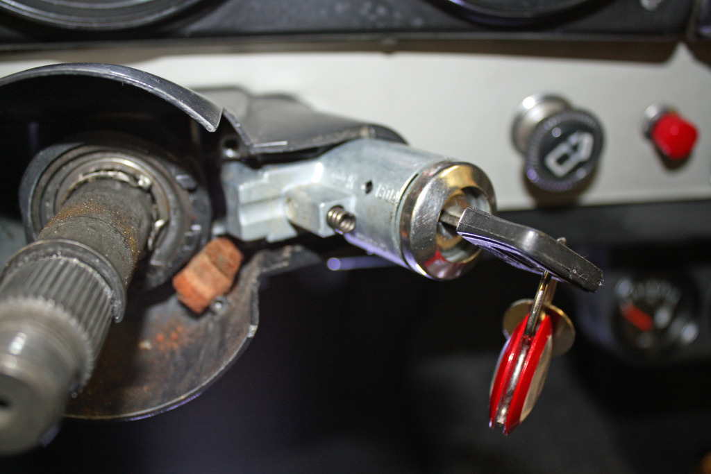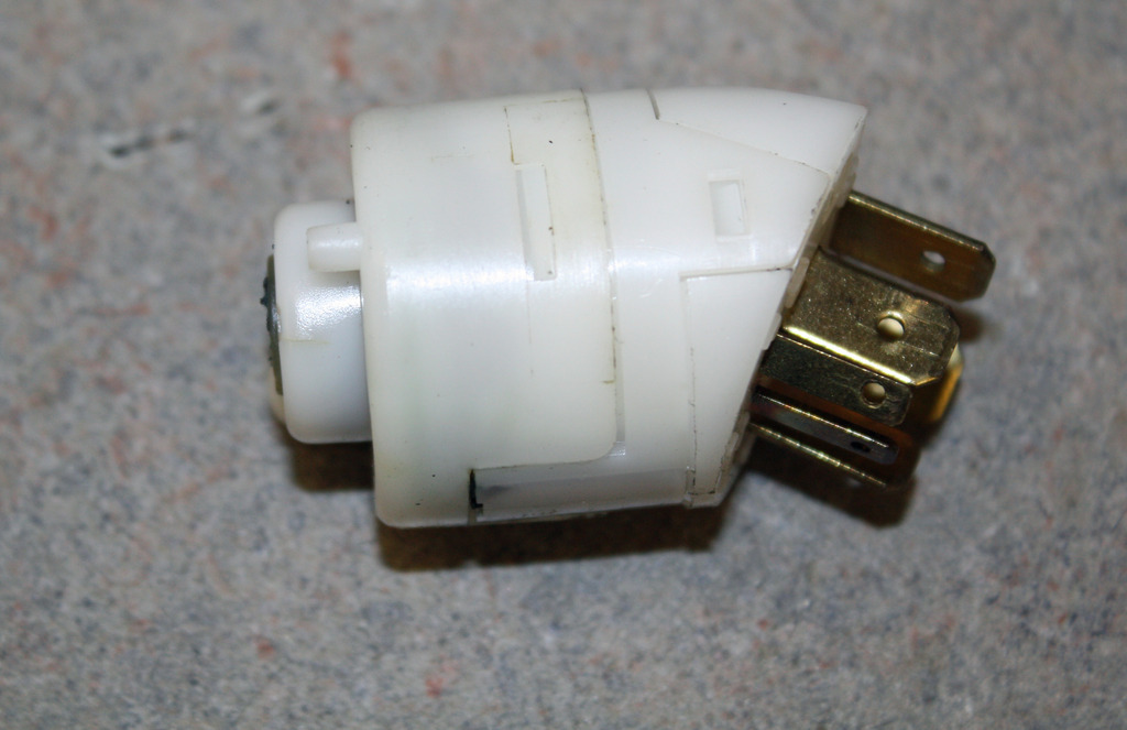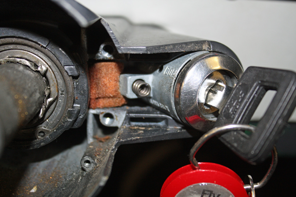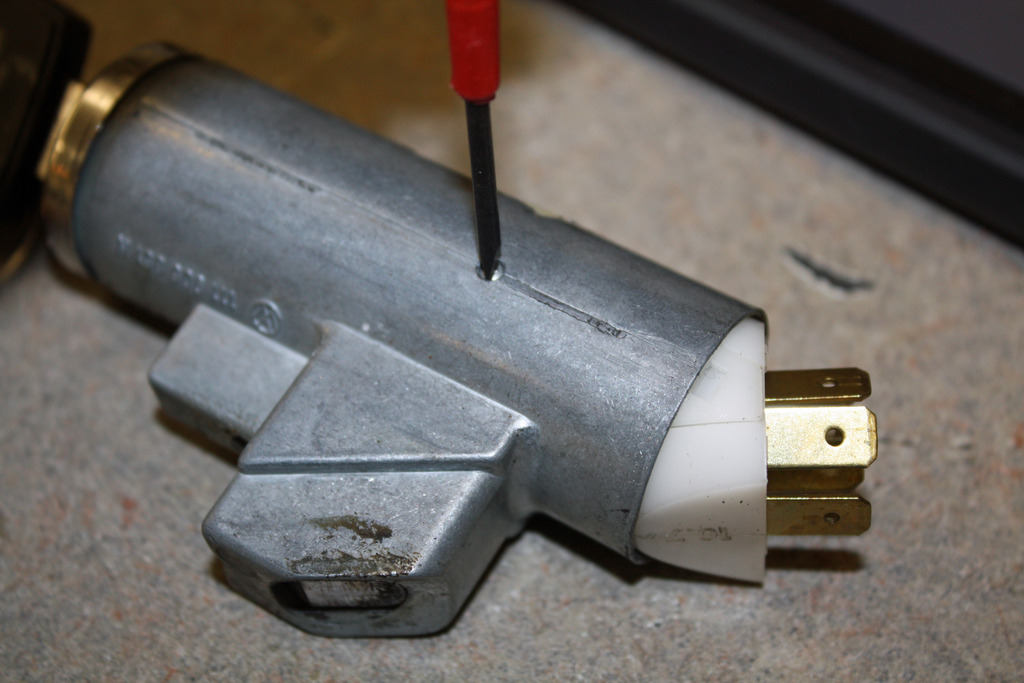 Now I could take the ignition switch housing to the bench to remove the switch. That is done by first removing the very small set screw. I did not see any obvious signs of faiure on the switch so I doubt installing the new switch will solve my problem.