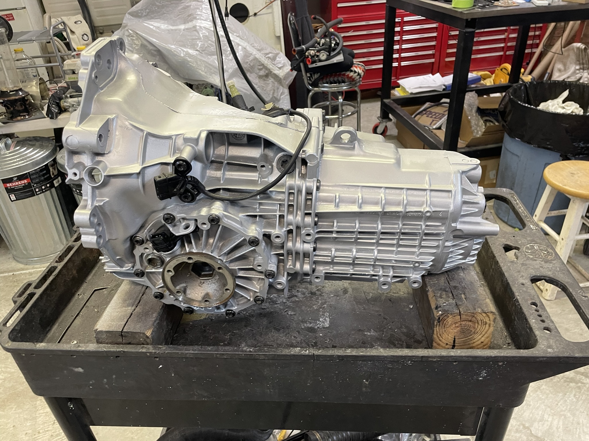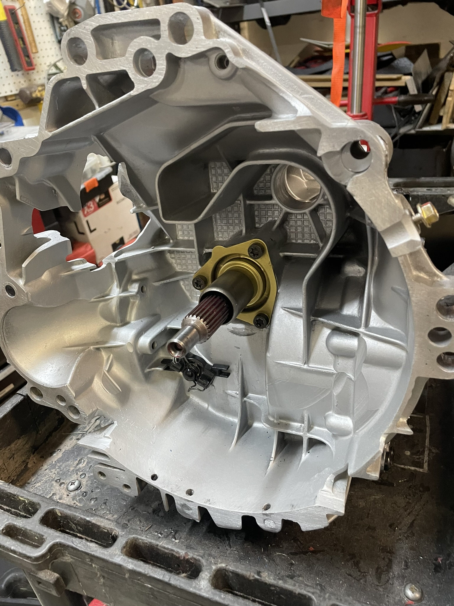 Time to get serious about the shifter mechanism! On this transmission, the shifter input shaft sits high on the passenger side. In the Boxster, a bellcrank and cables were used to actuate it, but I wanted something more direct, without the friction and vagueness that come with cables.