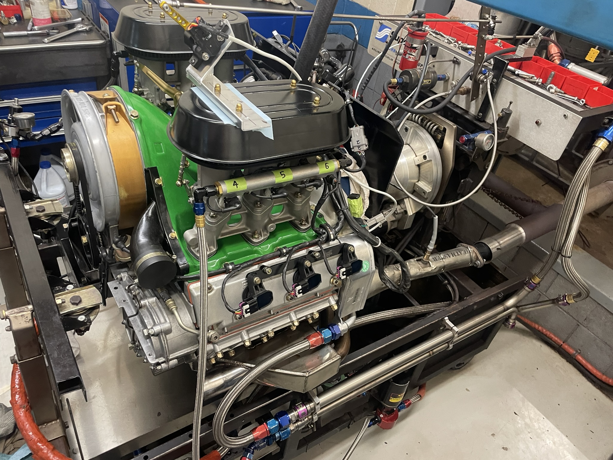 Next stop: the dyno! I borrowed a truck and hauled the engine over to my friend’s engine shop, which is equipped with a proper dyno. My friend usually tunes race engines for local short tracks, so his setup was perfect for this kind of testing.