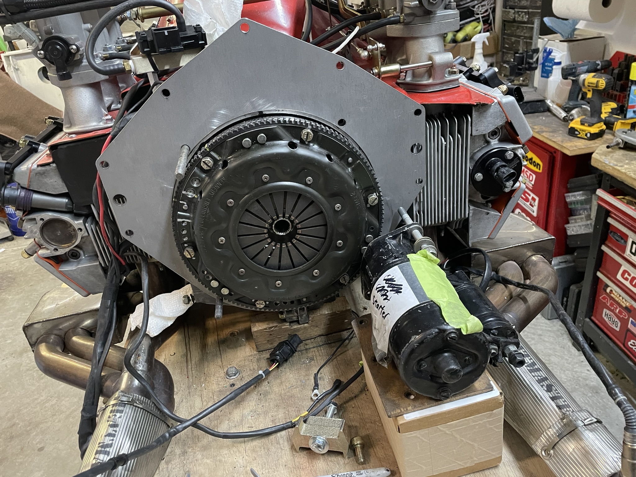 Next up: bolting everything together and checking the depth of the input shaft into the pilot bushing in the flywheel. Luckily, the hole in the side of the bellhousing (for the starter) makes this step a whole lot easier—it’s like a built-in inspection window!