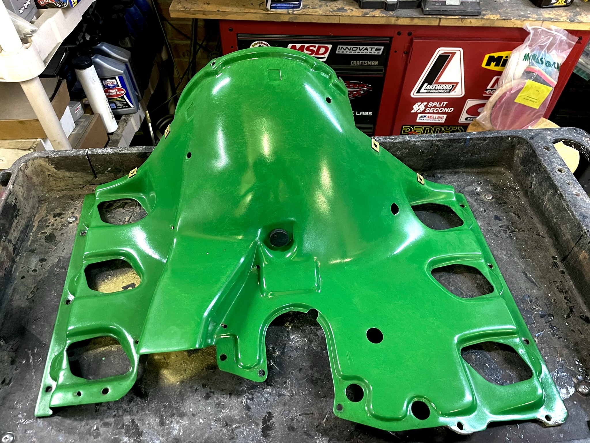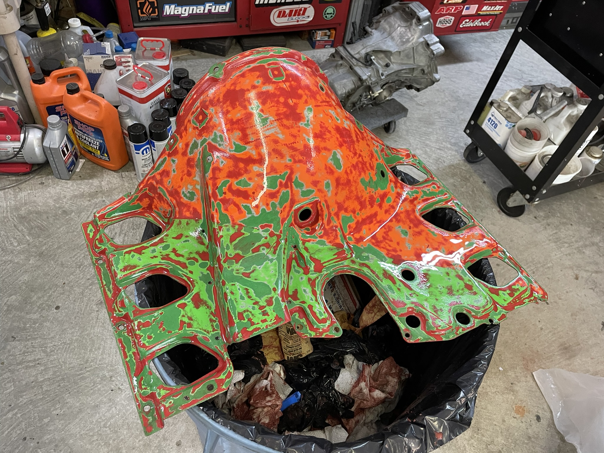 At one point during sanding, it had this wild tie-dye look, and I was honestly tempted to leave it that way. But in the end, I decided to keep going until I reached the original green gel coat underneath. The result is a cool, marbled appearance that I really like. Interestingly, this green seems to match the correct shroud color for the engine’s origins—a 1977 3.0 Carrera base. It’s a nice nod to the engine’s history while giving it a fresh and unique look. |
