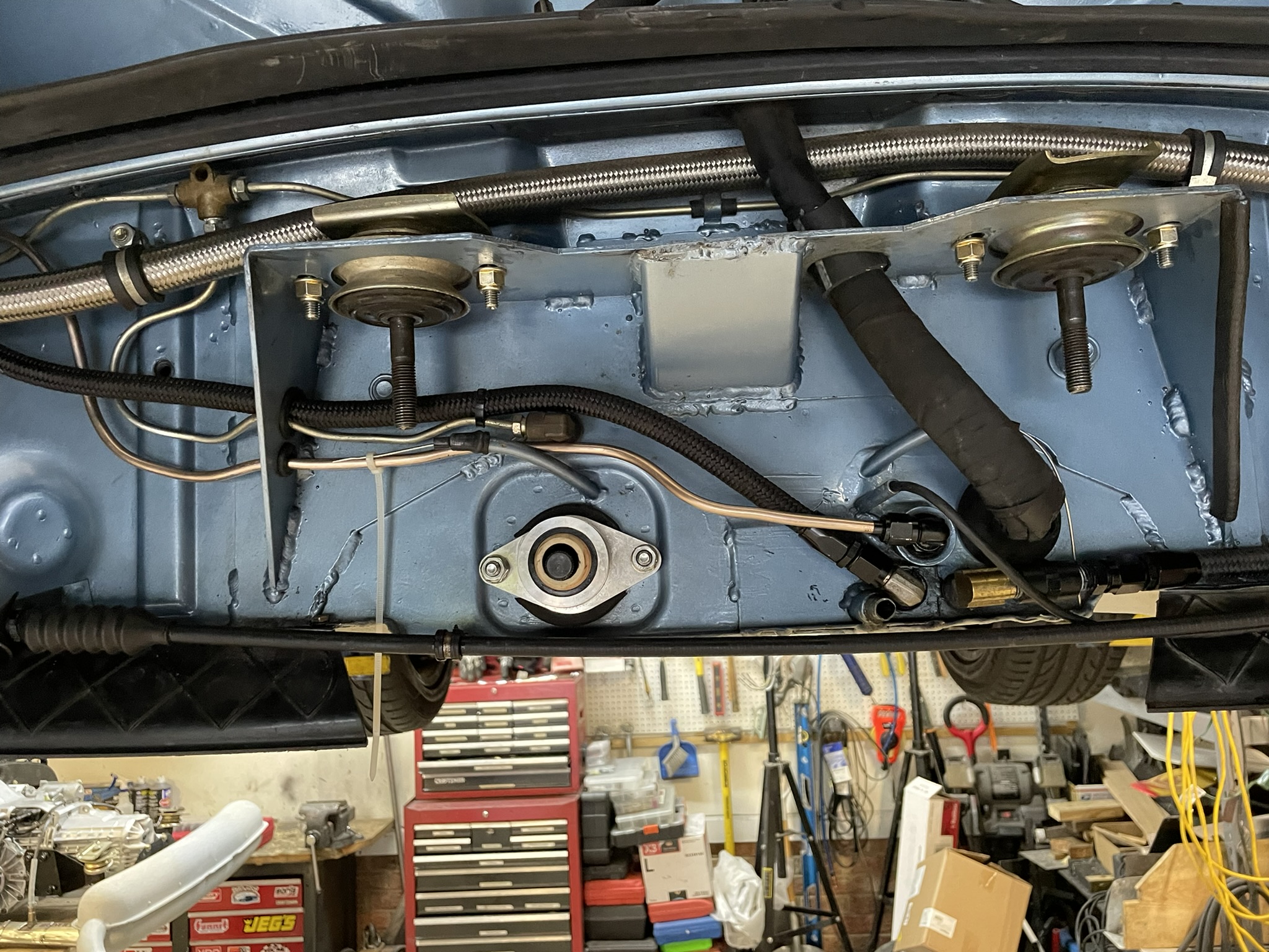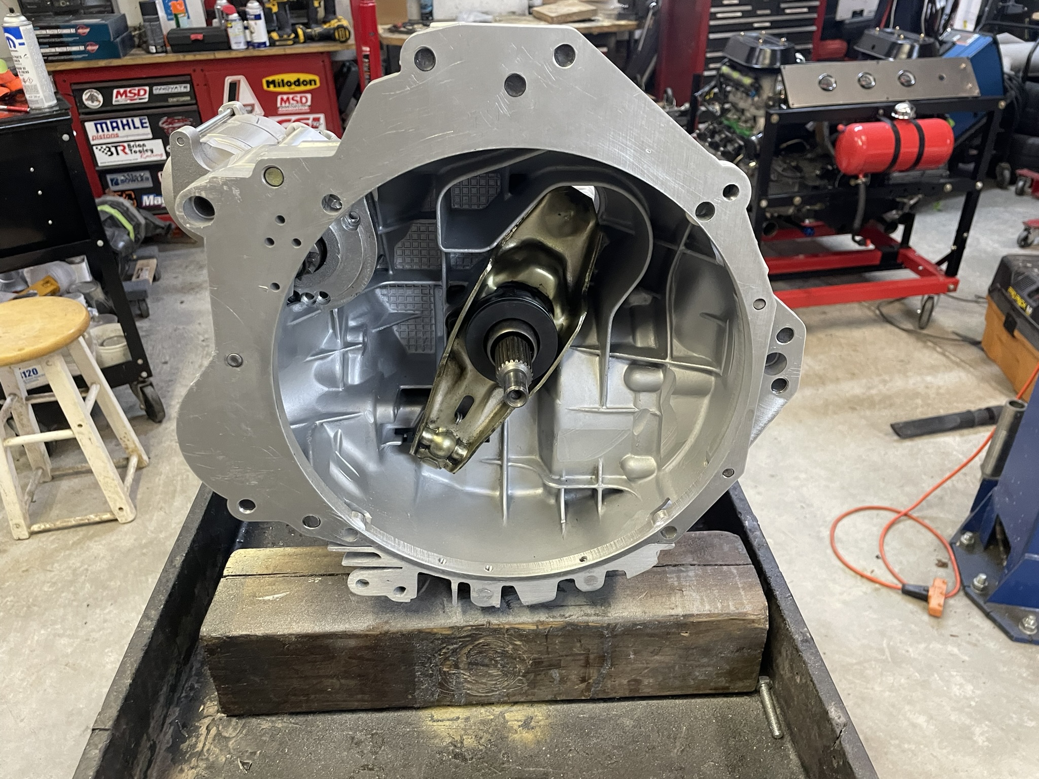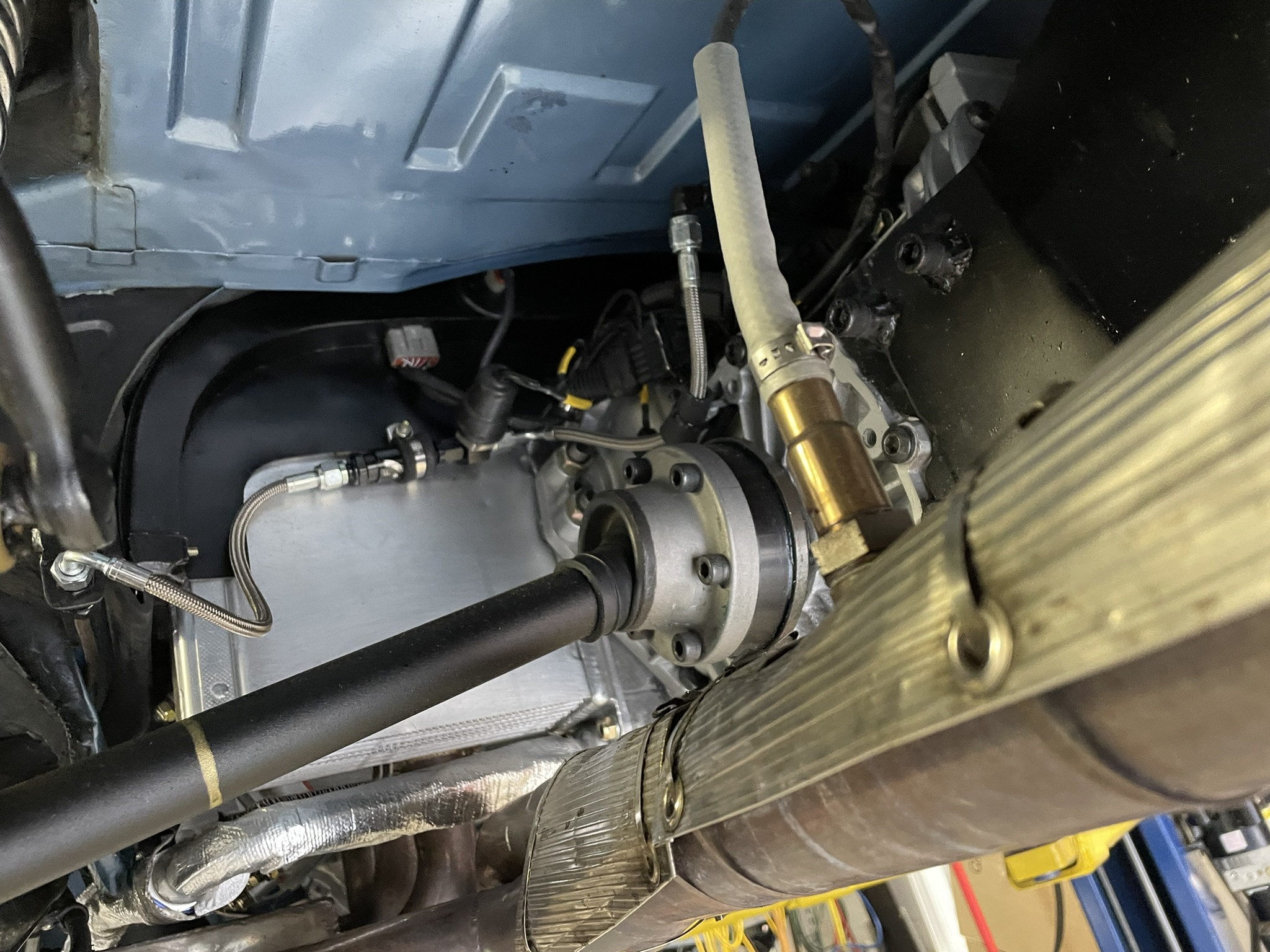 In the second picture, you can clearly see the shifter input shaft. Connecting that to the shifter shaft coming out of the firewall is going to be an interesting challenge for the future. I’ve already got some ideas brewing, but it’s definitely one of the trickier parts of this project! |