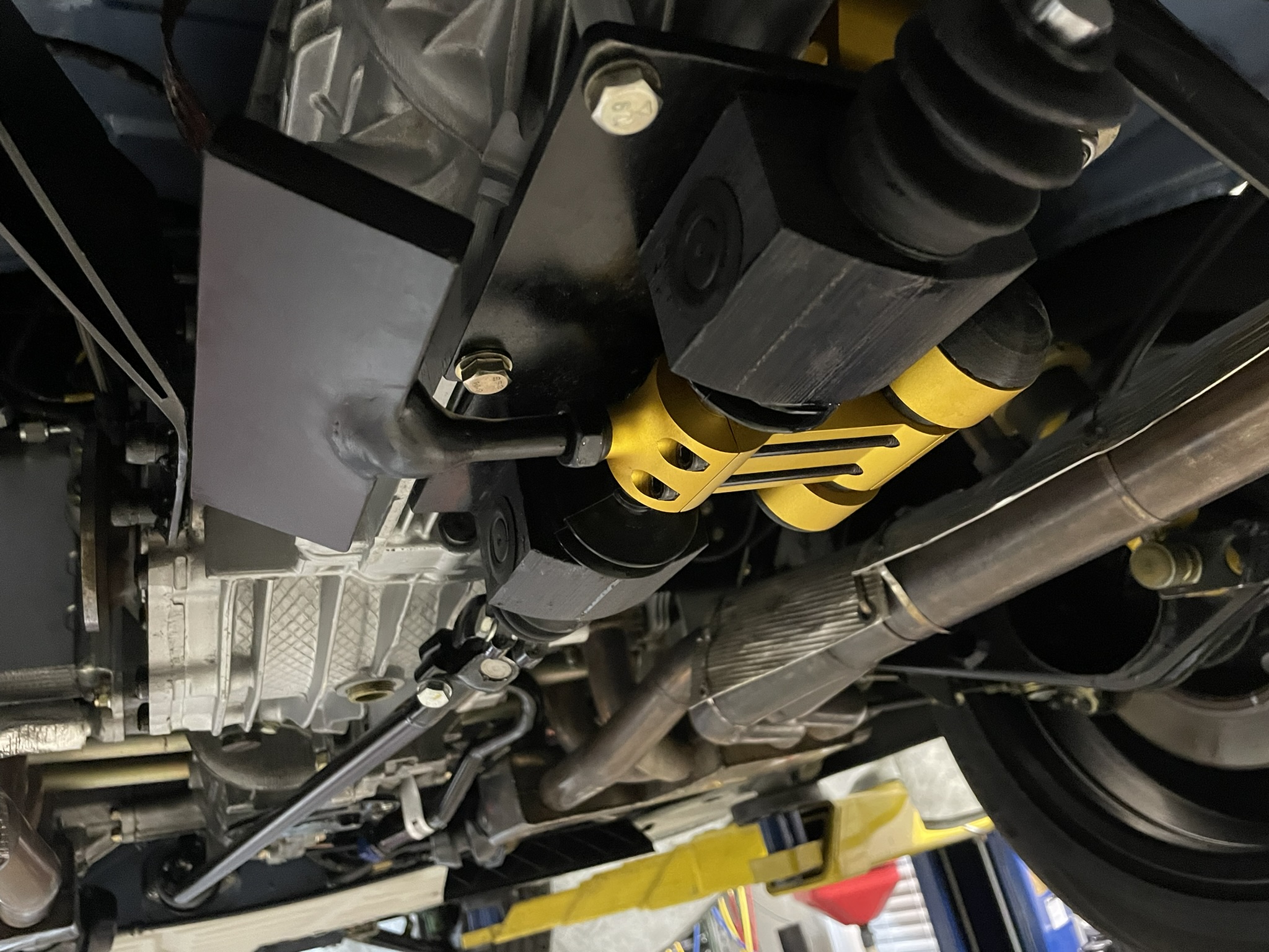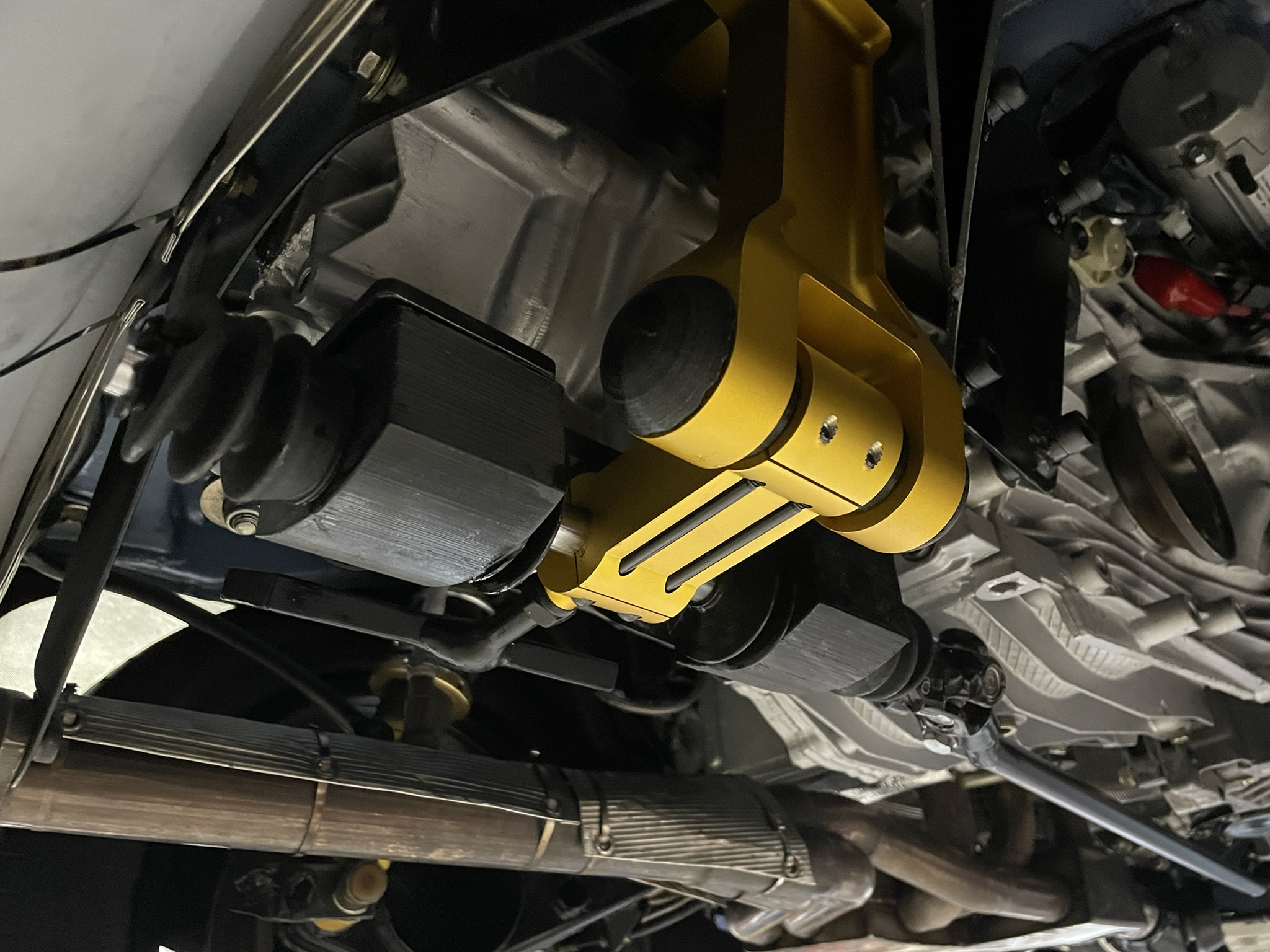 Oh, I almost forgot to share how I tackled the rear transmission mounts! With the engine and transmission supported from below, I started by bolting four steel spacers on each side of the transmission, using the standard mounting holes. For the usual transmission mounts, I added larger spacers to get everything aligned properly.