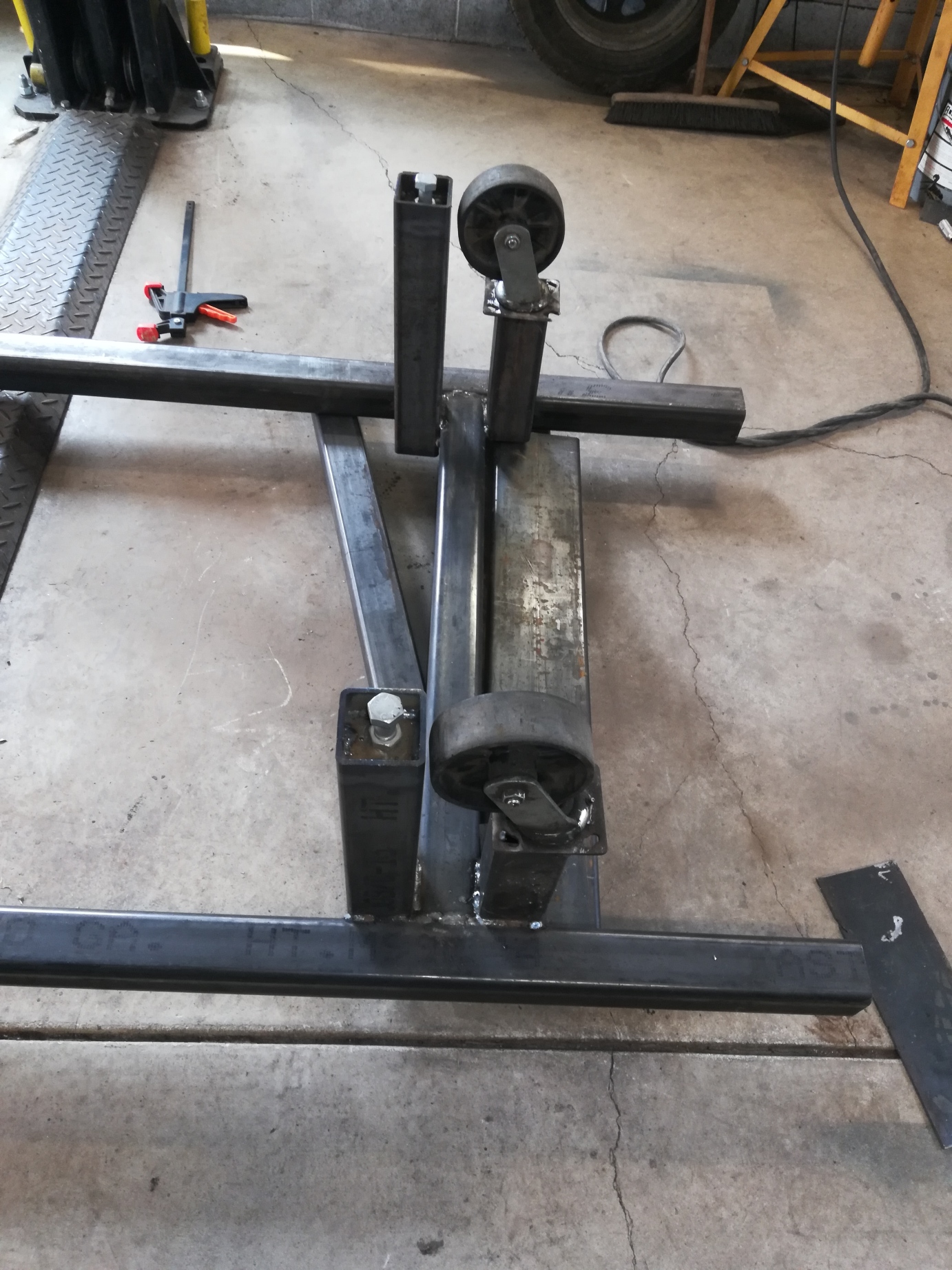 One of my decisions is whether to repair the drivers side lower control arm or replace it. I know you made some changes to the ball joints and there are also elephant bushings I would like to save. I see the bottom cover is off the passenger lower ball joint and can't tell if it's bad or just missing the cover. I'll have a better idea once I pull it apart. The update for today is that I was able to mount the legs to the jig frame structure. Working upside down, I mounted the fixed legs on the inside of the laterals. then it was obvious that I should put the wheeled legs on the outer side of the laterals. Then later I'll add a bracing between the 2 legs which should be plenty strong for whichever leg is in use. I also need to add some welds to the topside, now that it's flipped over and on it's feet. That was a challenge with to guys with bad backs. We were able to make it happen with jacks and leverage. My cheap jig wheels from the metal scrap yard work excellent, All I had to do is cut the welds that kept them from turning 360 degrees. They even have zert fittings and do roll very smoothly. Well, reducing the size fixed the picture upload. They were less than 4mb, but smaller fixed it. |