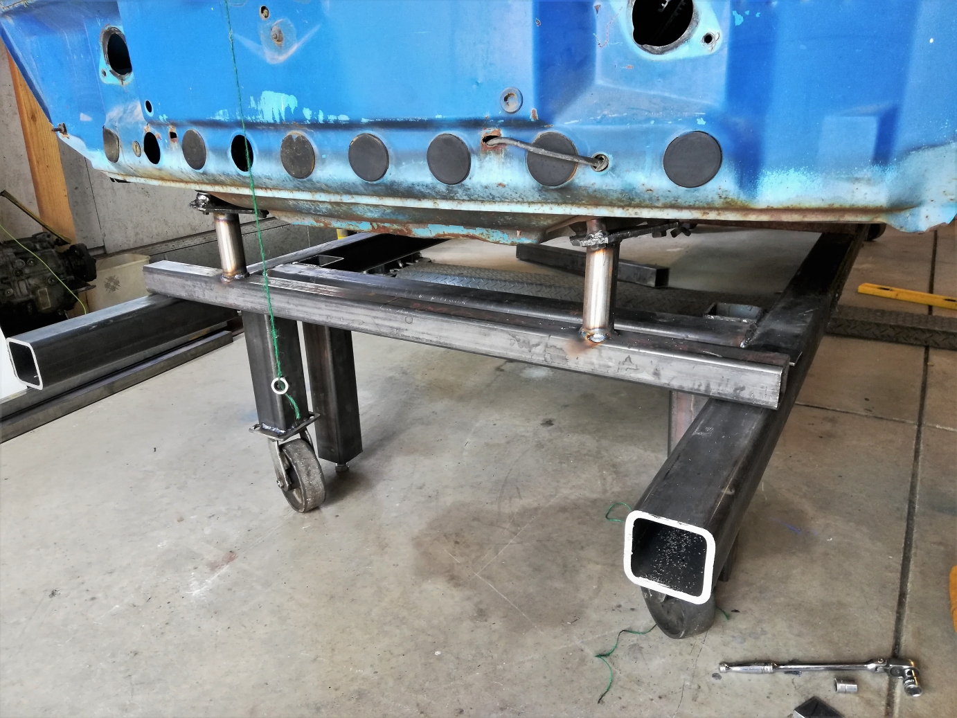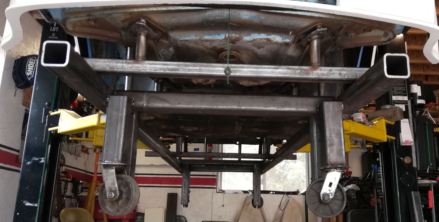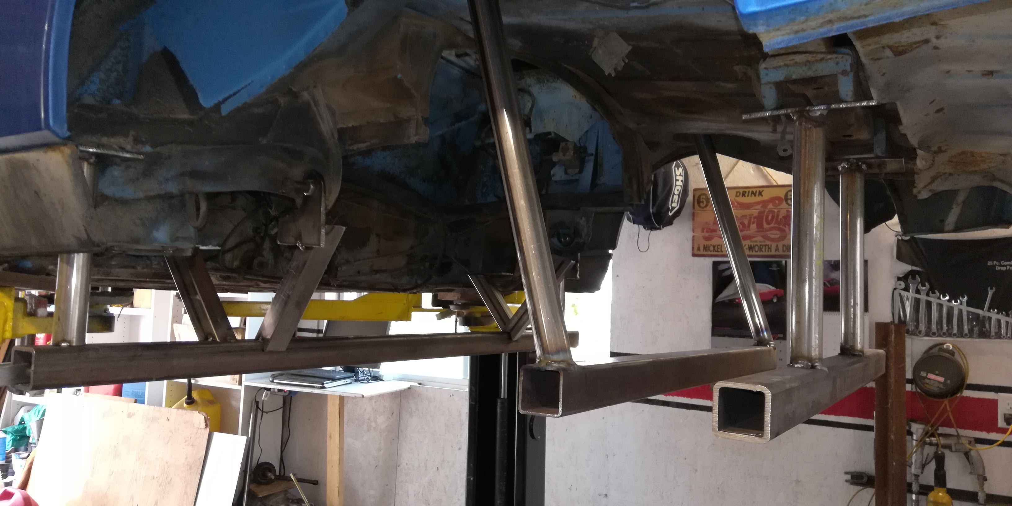 The arms are made, they are solid. No bracing needed. They seem to be holding in place without heat warpage. I did make a tactical error on the motor mount bracket. I put it on top of the mount since it was flat and easier to locate. Does make it very difficult to drop the frame. So I made a cut and bent it out of the way. i can put it back later if I want to once the jig is in place on the white car. Next step is to put it back on the blue car. Make sure everything aligns. Then drill for alignment bolts. Then I can pull it off for good and reassemble the blue car suspension to make it a roller again. Then the fun begins... |