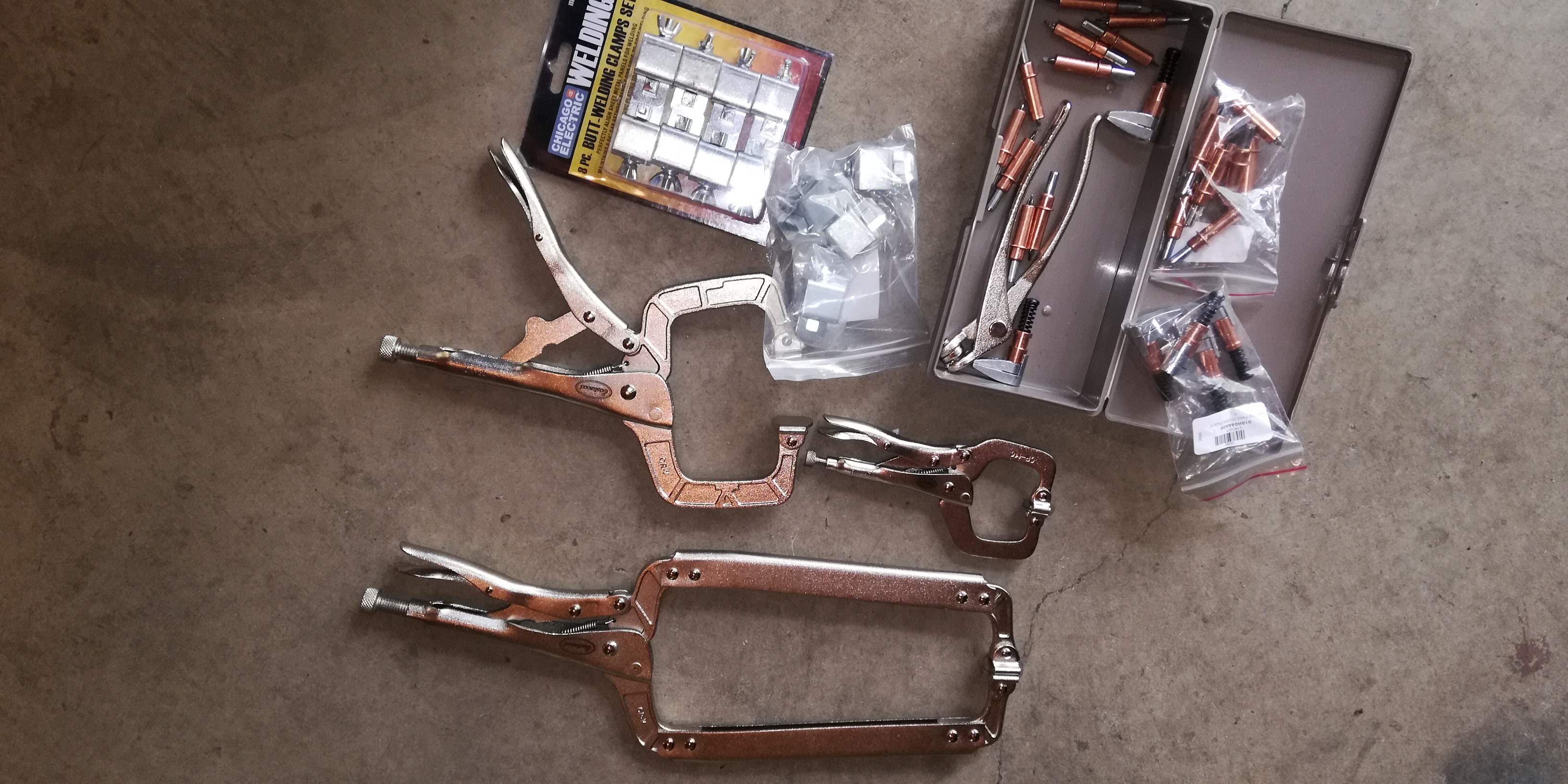 If your concern is not being able to lift it straight up you could unbolt and separate the arms from the jig on the ones that look like they will bind. I think it looks great. Did you get any body/seam clamps? I think doing one clamp on the front of the long would be a good idea. Give you something strong to hold the front of the body with while you separate the bad pieces. I'm not sure what you mean by seam clamps. Here is what I just purchased from Eastwood. BTW, the package of 8 is from Harbor Freight. 1/2 the price, 2x the clamps. A mid day update. All the arms are built. I have to finish welding a couple on the front. Then shim the cross bracing where it lifted. Most are flush, but a couple I got to hot too soon and they shrunk. I think I'm going to tac weld the cross bracing before I drill it. I can test the arms for clearance and so on, make sure they aren't in a bind. When it's where I want it, I'll begin drilling positioning pins/mounting bolts. That will be a chore as most have to be done from the bottom. Then I might throw a couple more welds on the cross bracing. i don't intend to remove arms until I'm done with the project. Then the welds can be cut off and the positioning pins/bolts can be used to relocate for future use if need be. Forgive my ugly welds. (IMG:style_emoticons/default/welder.gif) It's hard to get in a good position and I always rush these things. I switched to square tubing on a couple on the back. It just made more sense. |