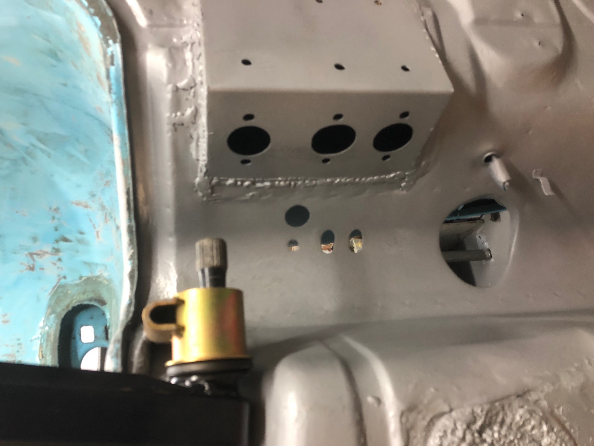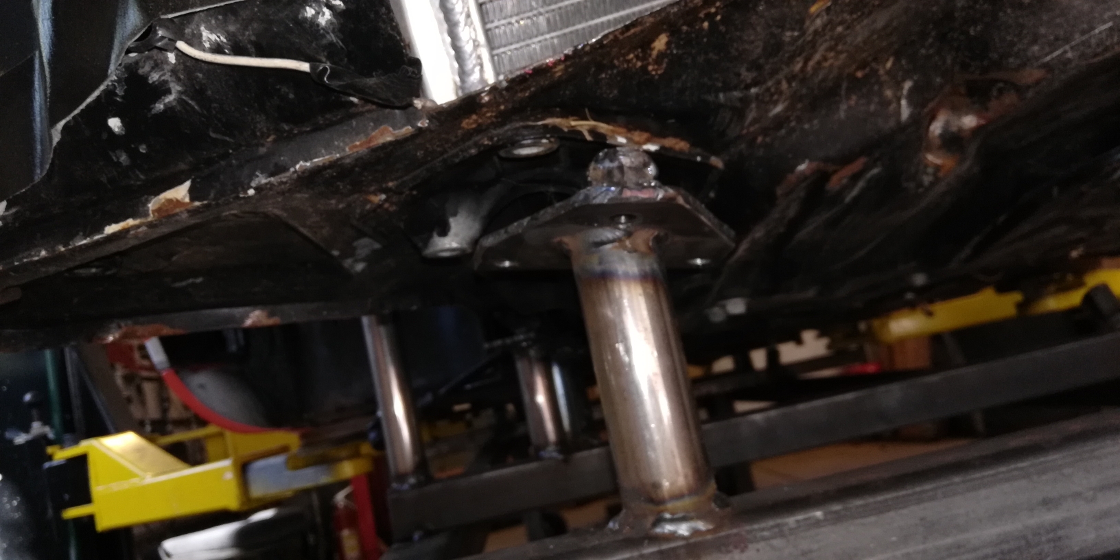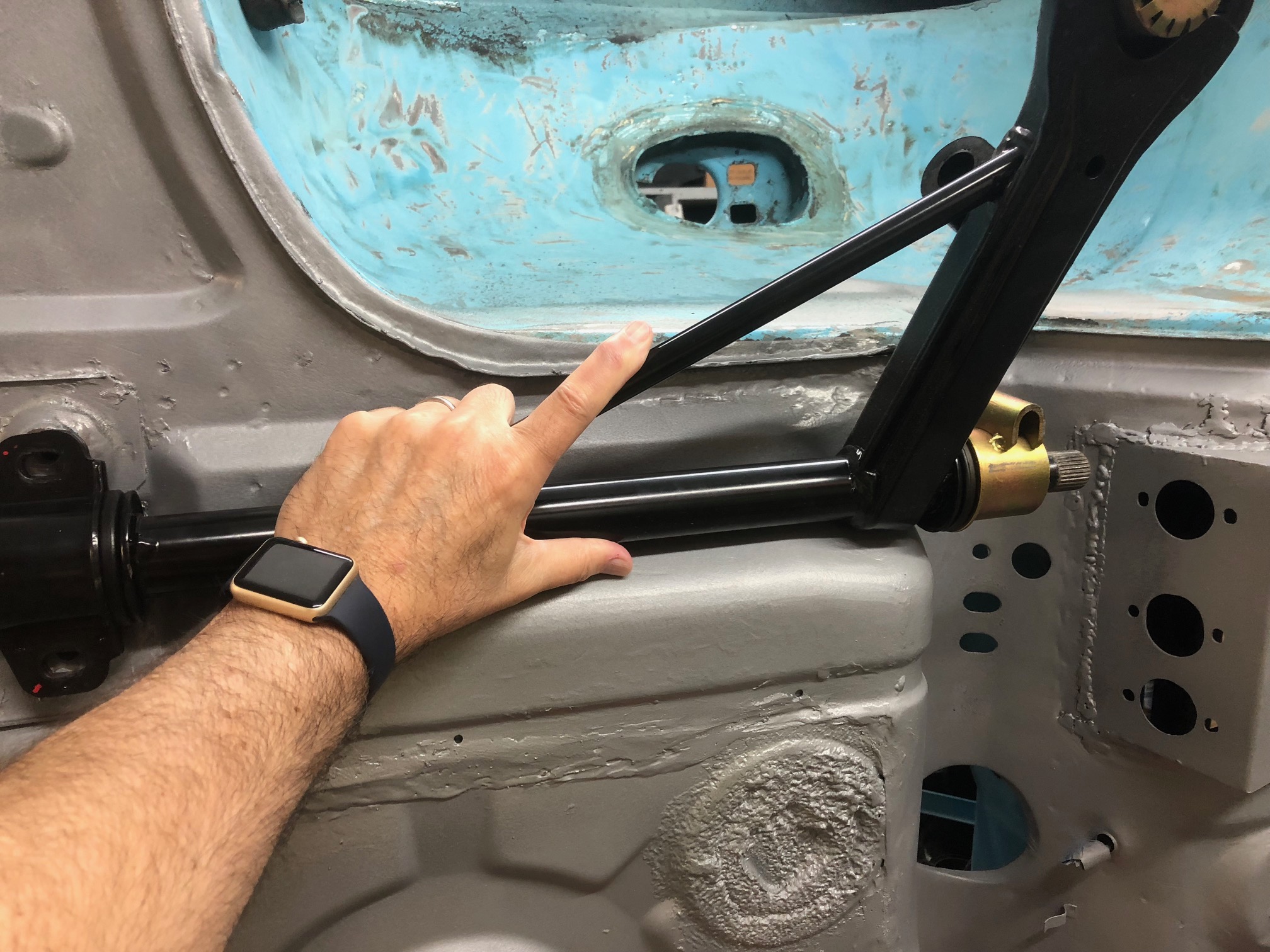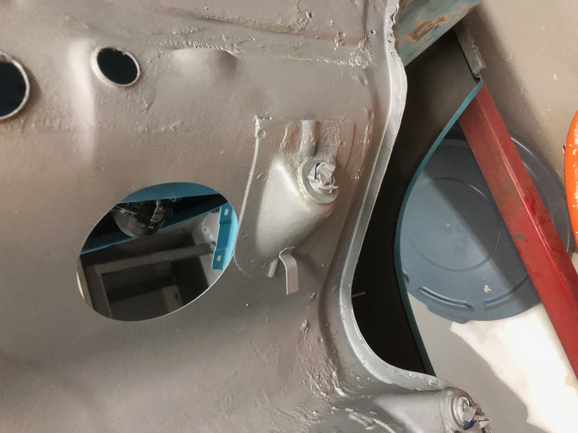 I want to point out that the suspension points is there on your car just the one piece shown was removed to fit the box for the peddles for brake and clutch master. My V8 car with 930 is the same. Bill that built your car was very kind to me and gave me the bent metal to fit these parts. The suspension is bolted to the front points and the point where the rack is. The under-sway bar point on the driver’s side is not there and our cars (mine and yours) need the over the top bar like you have. Now the cover will not have 4 points to bolt up. I am working that out