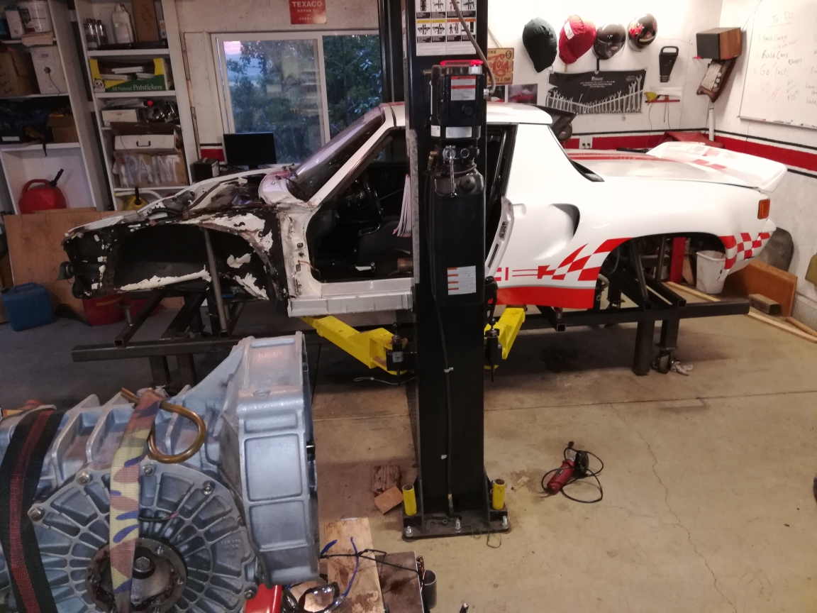 I finished with removing the suspension and made an executive decision to not pull the engine. What can I say, I'm lazy and was only going to do it because I was curious. Well, I'm not that curious. So I decided to just pull the trans so i could connect the jig to the rear trans mounts. So the trans is now out and the next step is to connect the Jig to the body and see where we stand. The initial try showed me ai need to trim some excess material around one of the plates in the back. Then it should drop down. I did notice that a prior mod to mount the clutch and brake master cylinders eliminated one of the mounting points for the drivers front control arm. I'll need to see if that will be a problem keeping it from dropping down all the way. Or if I need to put it back or just eliminate it. |