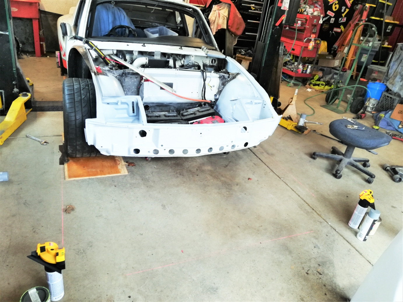 Starting out the New Year with some good news. The alignment looks good. I used the String Alignment theory to create my own version of a laser alignment using floor tile lasers. I stopped short of completing a perfect alignment but it’s there. I also did the ride height and corner balance. Height looks good while maintaining a good balance. I’m at 50.6% LRxRF 49.4% RRxLF and 42% front 58% rear 50.1% RS and 49.9% LS and just over 2500# total weight with my weight in the drivers seat. That may change slightly once I get everything back in the car but it’s close enough that I can work with it. My next step was to take the suspension back off and complete welding. So that’s where I am now. I’ll have a list of items to do so I need to get it going so I can be ready for the first SSCC event in March. I had to get the jig out of my way so I put some paint on it and taped it up as best I could and rolled it up the hill and out of the shop. If someone is in need of something like this, hit me up. I could be persuaded to part with it for my costs. If not, it will become my new work bench. |