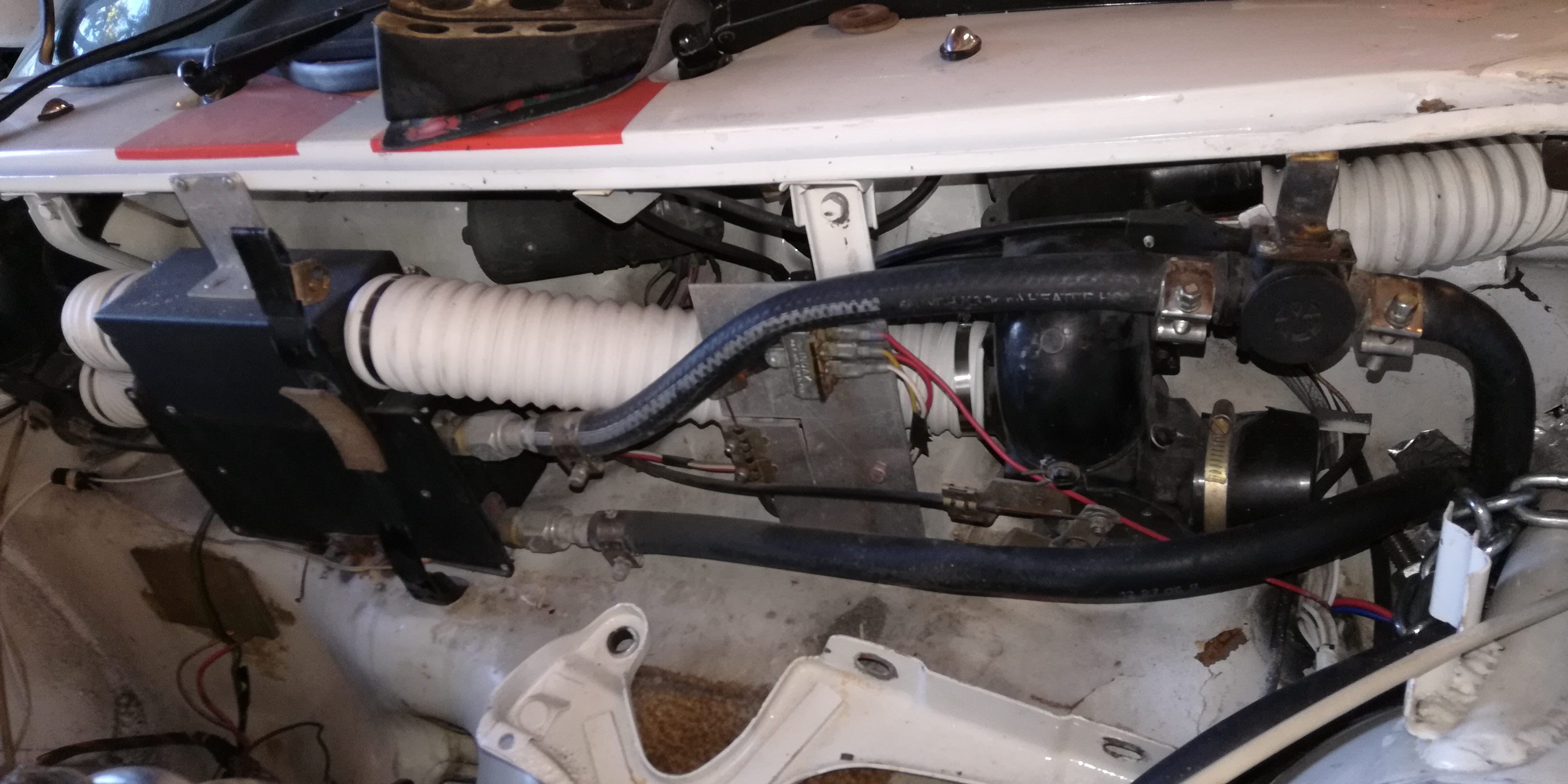 Congrats on another stage conquered. What is the heater setup like? That is one part I have not settled on yet. Basically the heater is a standard water heater core fed by 2 heater hoses coming from the v8. They feed down the driver’s side long and up into the front above the driver’s feet. They feed the custom box shown, (maybe a hot rod product?). That feeds what I believe are standard 914 air distribution valves. Here are a couple pictures before I molested it... Thanks for the pictures. So the hot water comes from the rear? I wonder if there’s any way to come from the front by the radiator? |