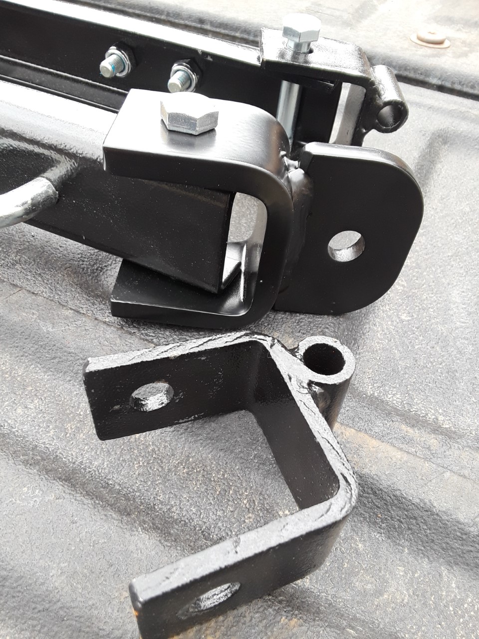 Here's picture of the new adapter compared to the original HF mount. we used 3/8" steel, they used something less than 1/4" but close to it. We also moved the hole to raise the bracket some giving it a clearance similar to the Empi tow bar.