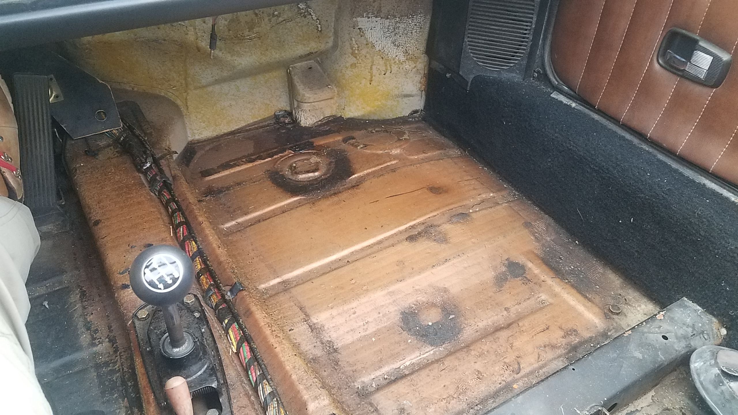 Car runs and drives, but is cosmetically ugly, it was originally copper, but one of the previous owners painted over the copper to make it look green, now the green paint is falling off. ANYWAY! My intention is to drive it around with spartan interiors, just the essentials, no carpets and barely any electronics to keep it simple and fewer things that can go wrong since my goal is reliability (yes, it's a daily driver). So this past weekend I started gutting the interior and removing all the carpets, expecting to find metal panels that I would look closely at for rust damage and evaluate if I they were going to need to get replaced or repaired or what.. to my surprise, I did not find metal, I found what I believe is fiberglass or some type of cardboard panel covered in resin. It looks like one of the previous owners laid up fiberglass over the metal panels, either to protect them from rust, or to cover all the rust spots that were already there. I tried searching for info on this already to no avail, looks like it's not common practice. Has anyone else seen this done before? Should I be worried? what would you recommend as a path forward? |