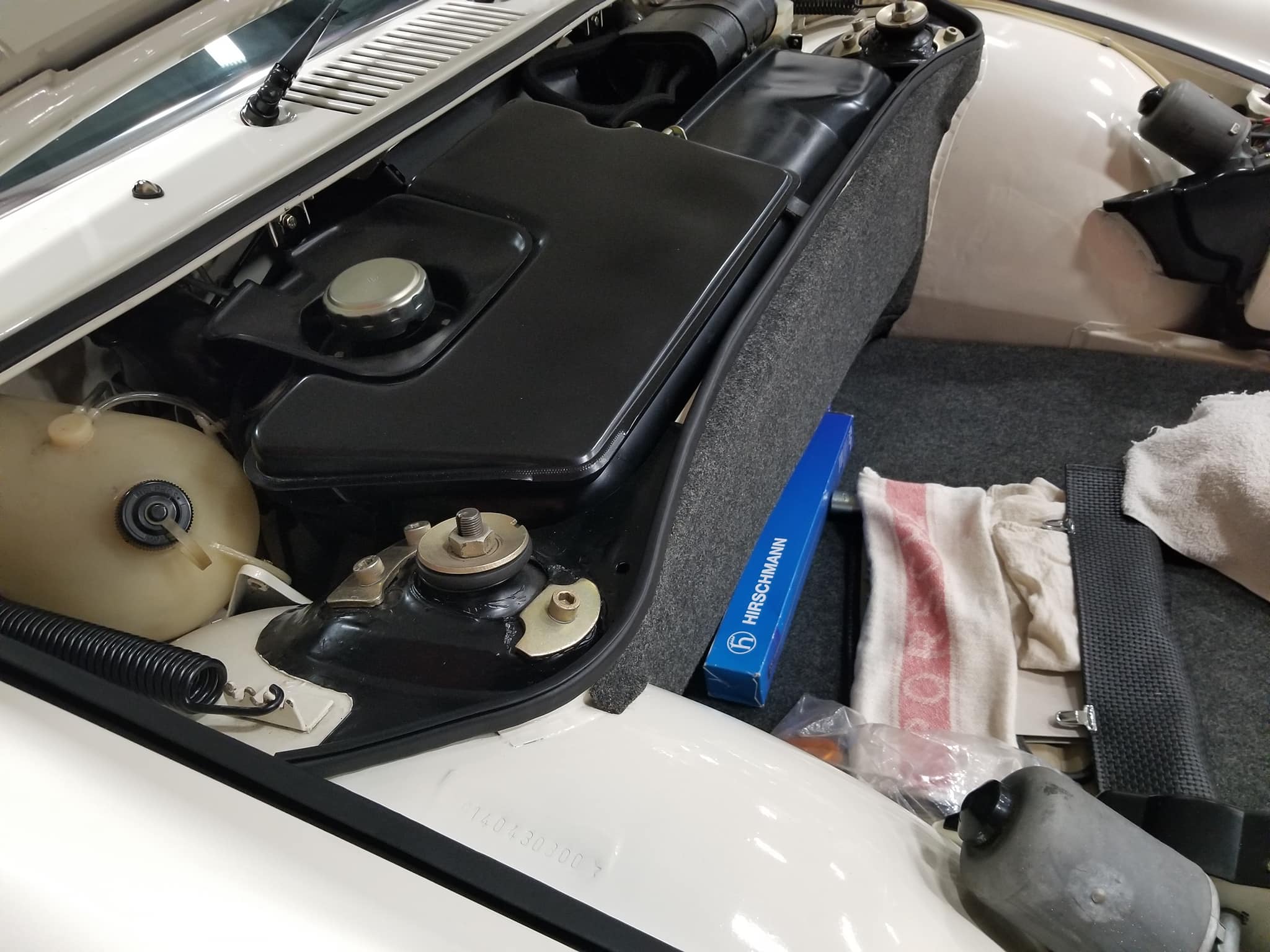 It has a front license plate bracket on the rear bumper. The original OE rear trunk carpet did not have the hole and brass grommet for the spare tire hold down. Late outside mirror. The black undercoating on the pan is odd. Might be trying to replicate what the dealers did when they arrived off the boat.
