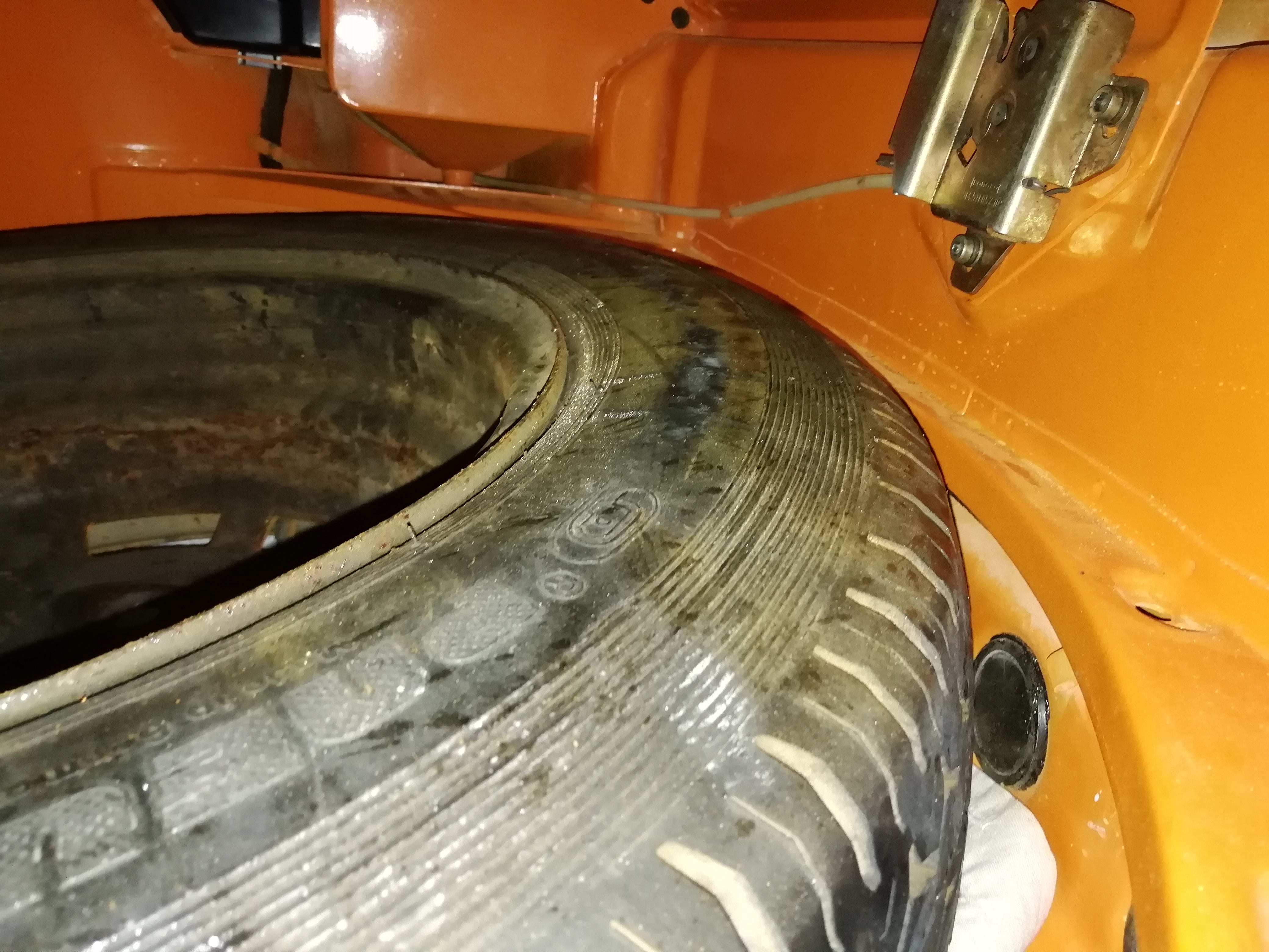 I have original steel wheel with 165/15 tyre however it sits higher than what i assume is the shelf stand. no matter how i position it, it seems wrong for the shelf to fit on top. If i raise the rear end (by the tank wall) it sits higher tjere and the hold down bracket doesn't line up. no accident damage or other repairs done in that area. There was no spare when i bought it so i have no reference. |