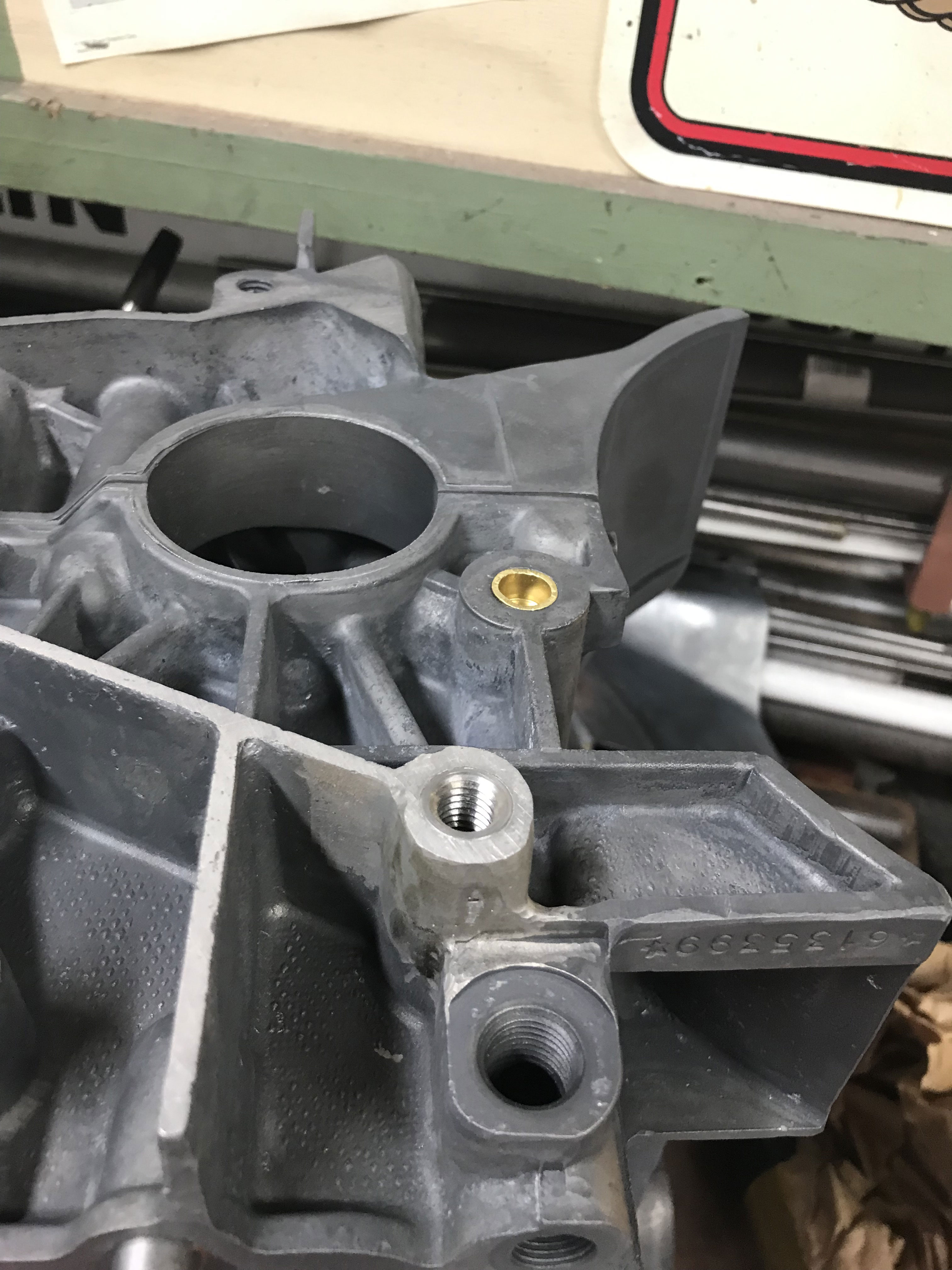 Before: ![]() After line bore to standard bearing size: ![]() I'm very happy with the clean up on this main bearing saddle. Perfection was out of the question. In the end the bearing is well supported and the really crunch looking porosity is gone. |