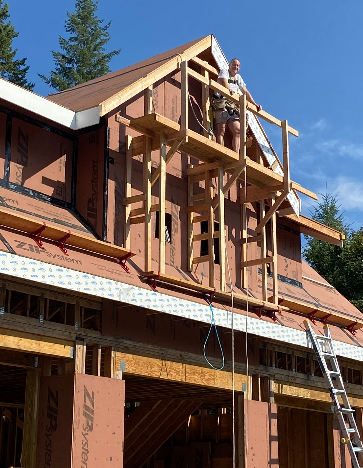Are those working decks 2x4's with plywood? @930cabman Yes, basically but used scrap 3/4” T&G subflooring that was leftover from the 2nd floor subfloor build. 23” wide or so. I really don’t like working off the 10” toe boards at the edge of the roof; too narrow for my comfort. 2x4s limited to about a 6’ span. Always have a harness on when I’m up there. |