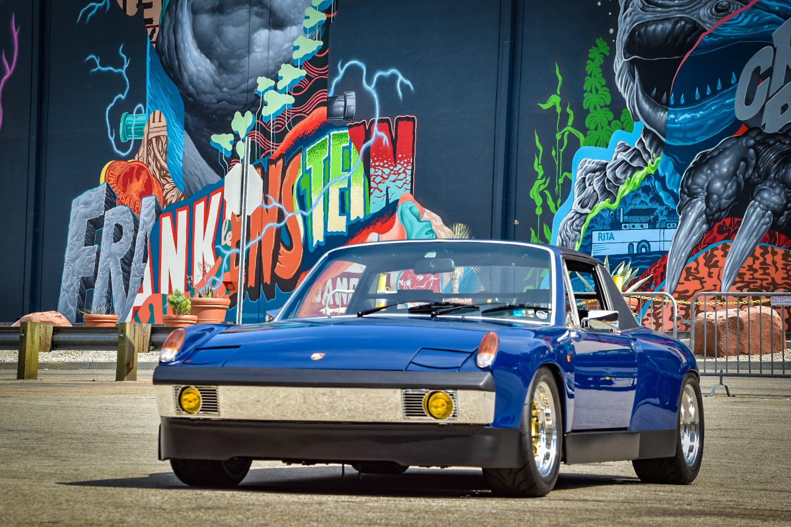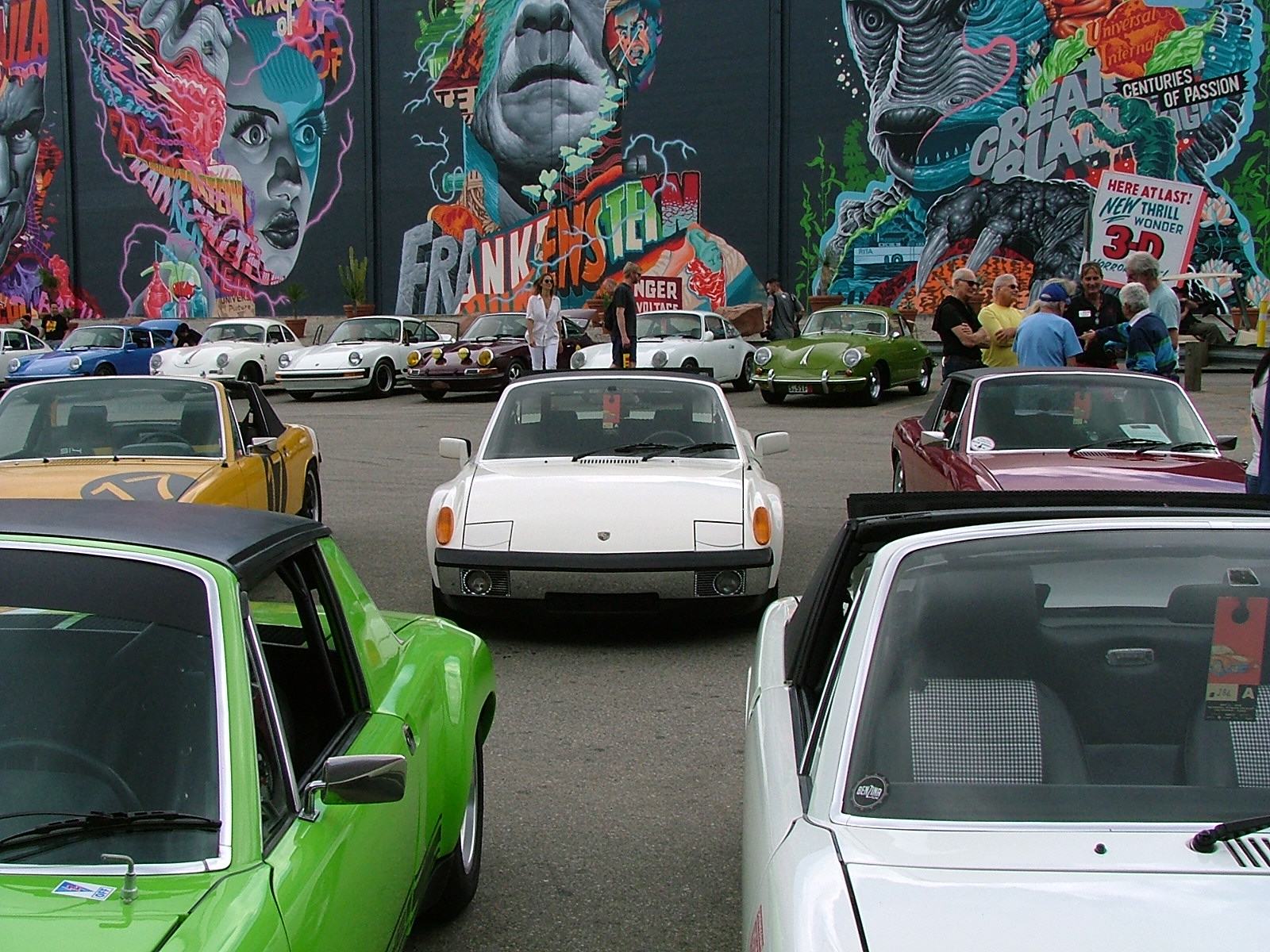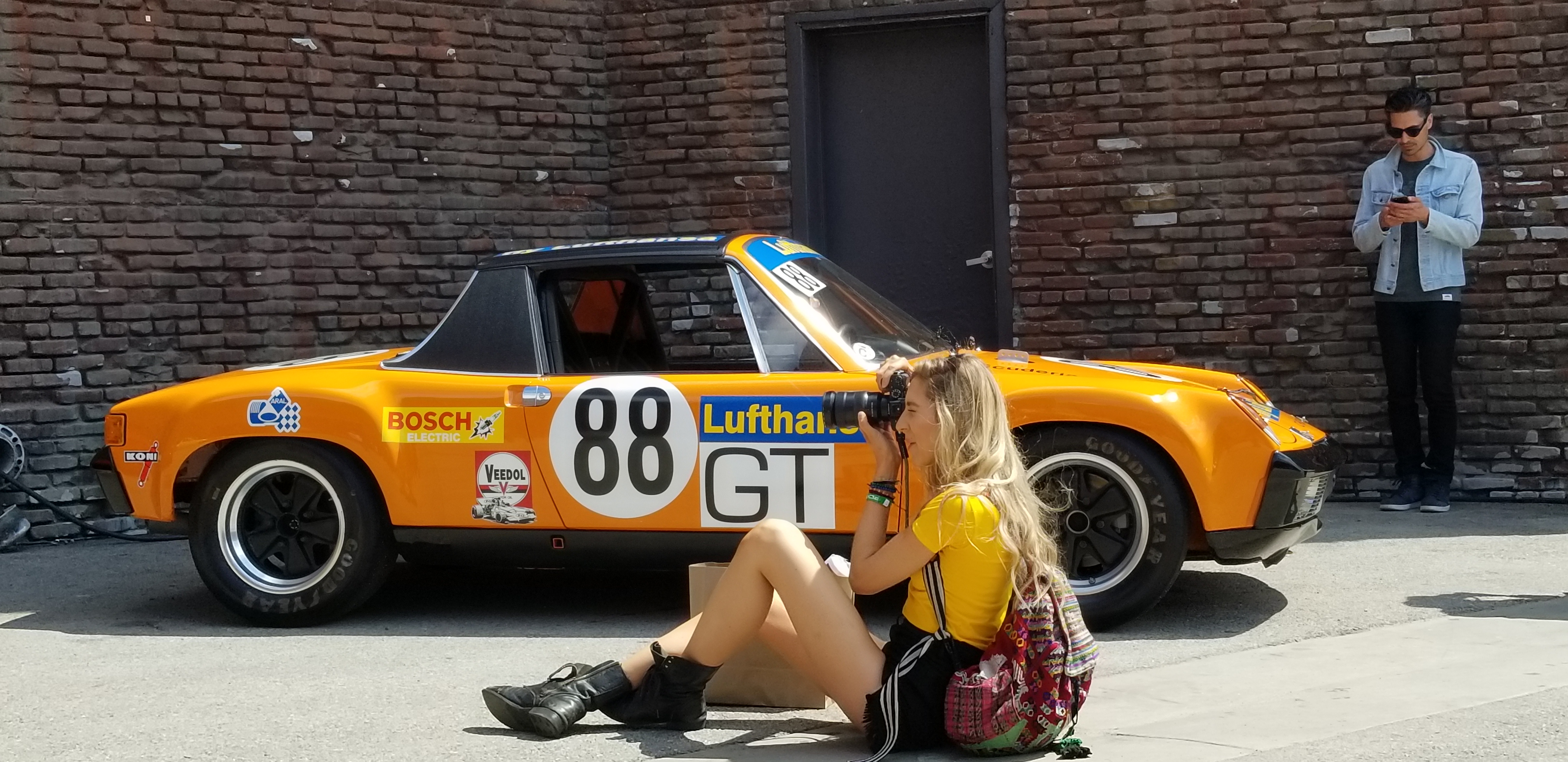 It was hard to take a bad picture, neat back drops everywhere. Loved seeing the 914 race cars and the 916. One guy looking at the 916 said, nice fake, almost perfect....LOL This "Fake" that was special ordered by Frau Piëch, ex-Otis Chandler, ex-Matsuda Collection, and today in new ownership. Right on to that windbag of an opinion, guess he will never know what he was eyeballing. Patrick Long and staff staged this yellow beauty just in front of the brick wall , alone by itself without any fanfare nor signage...to be the "Wallflower" . Most of us here with the keen eye, or others curious enough to ask around for answers could figure that this one of the limited 916 run. |