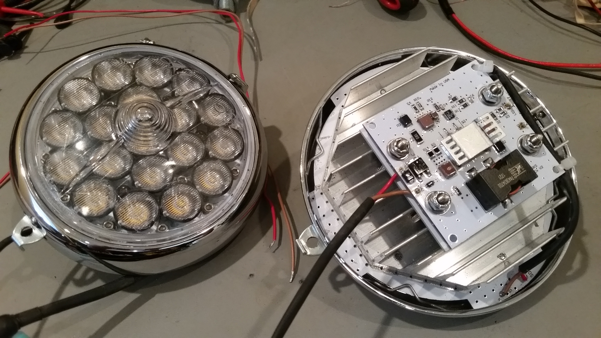 Why not mount the power supply remote in an IP65/67 enclosure mounted behind the 914 grille? It would free up some space and maybe reduce temps inside the light assembly. This is what I did for the 356 running lights although the boost converter PCB was mounted inside the housing. I proposed a separate box to put the converter in but the owner didn't want an external box so I mounted on the back of the heatsink. I'd like to keep it to one PCB for simplicity although a separate module may be needed depending on temperature rise. |