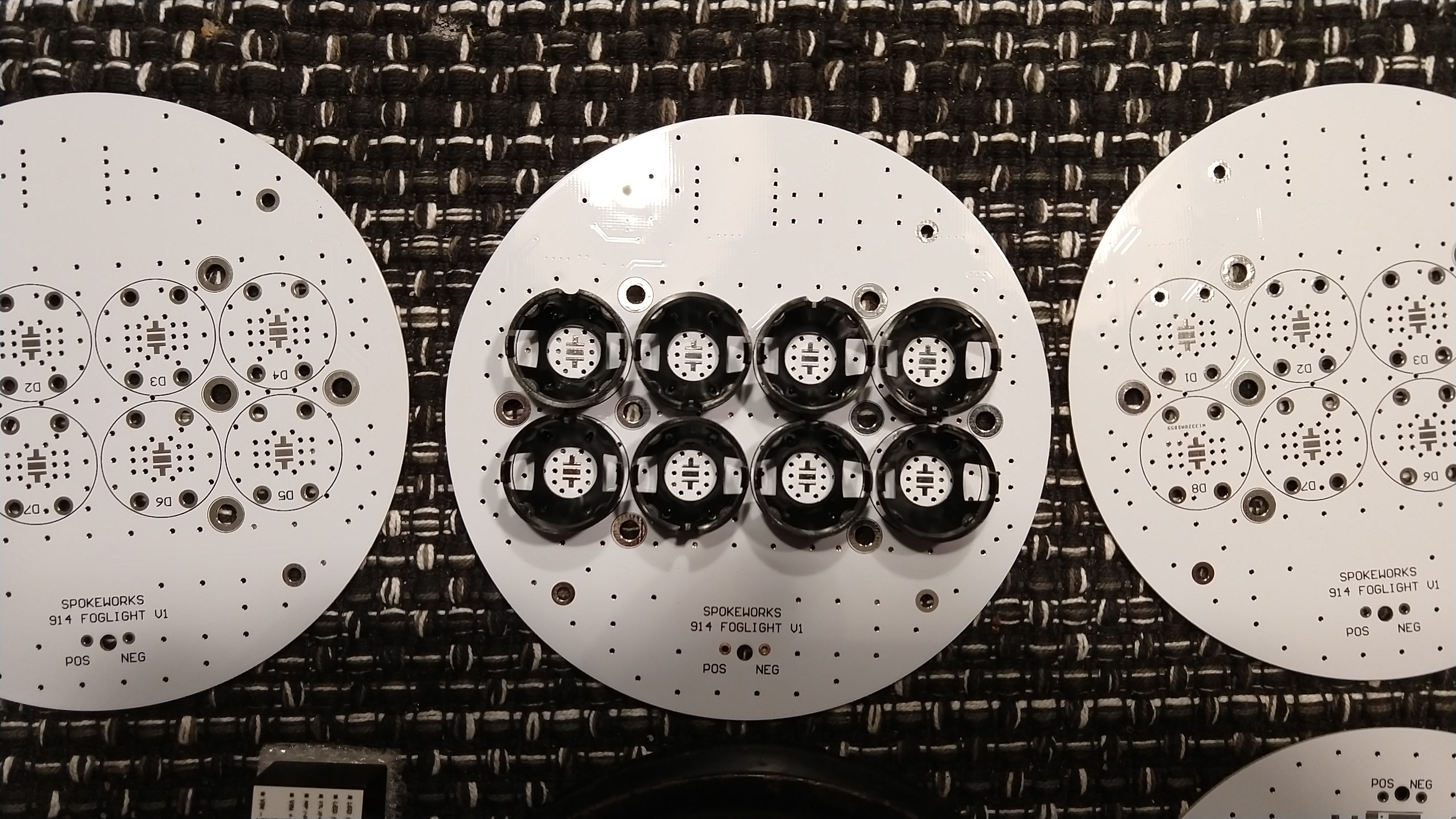 Here's the PCB under the glass. It will be interesting to see how the fluted glass will diffuse the beams. The LED lens already provides some lateral diffusion.