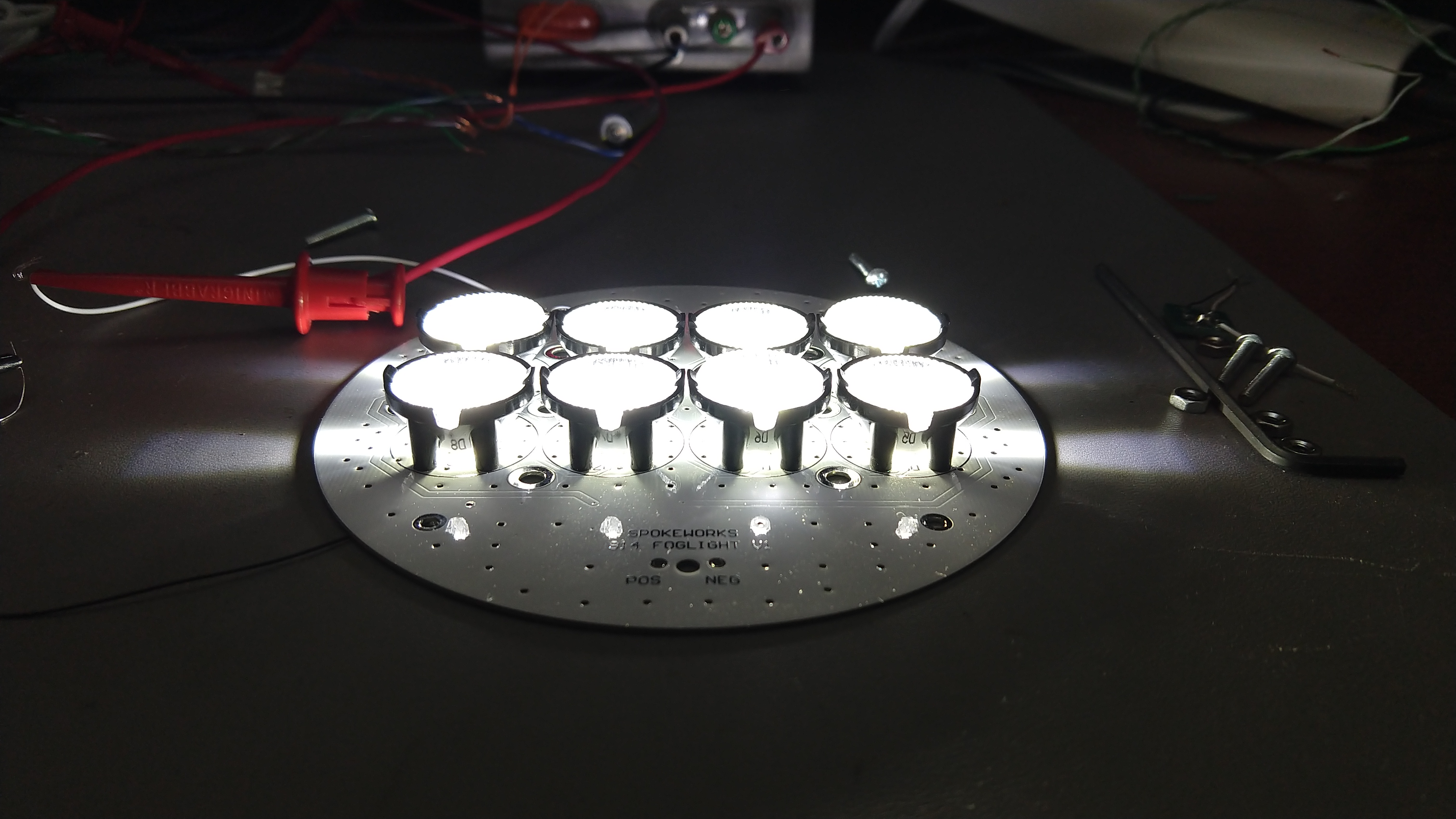 Started doing some burn in on the first unit. Will run this for a couple of days to make sure it works. The LEDs are running 0.5A and the total unit power dissipation is just under 14W or just about 1A at 14V input. Comparing the light output with the headlights on my '14 328, these are less than 1/2 as bright. The headlights on the 328 measured 19000Lux at 1 meter whereas this unit measured 8700Lux with the glass lens. From early measurements, it looks like there's about a 40C rise in temperatures over ambient. That's about what I expect. It will be interesting to get this in an enclosure and see what happens. This is so cool, I am really enjoying seeing your progress on this project! Jeff B |