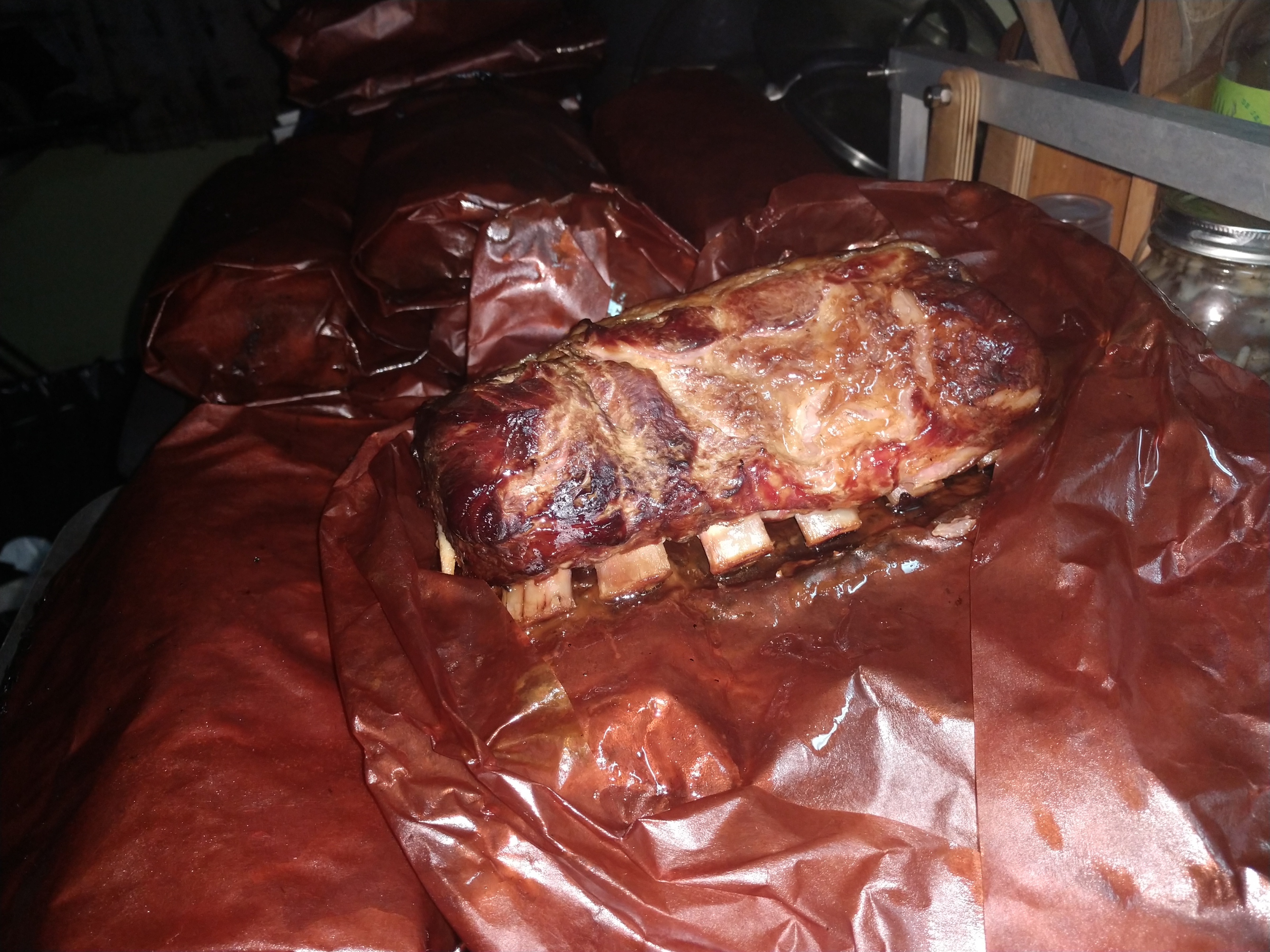 To go with the 9 already here. The process takes me all-day, 2.5 hrs of smoking. When they look good enough I wrap them in pink butcher paper after coating them in SMOKED TALLOW. These last 2 things changed up my game. My RIBS are sweeter and juicy plus wrapped in the pink butcher paper they cooked quicker. I leave the ribs in the smoker until they have about 3/8" of pull back(3/8" of bone showing past the meat). I'll post a picture when I unwrap them. 15 racks that's about 270 bones. The picture shows about 1/2" pull back, if I twist a bone it will just come out... Oh boy, I can see some guacamole coming my way. |