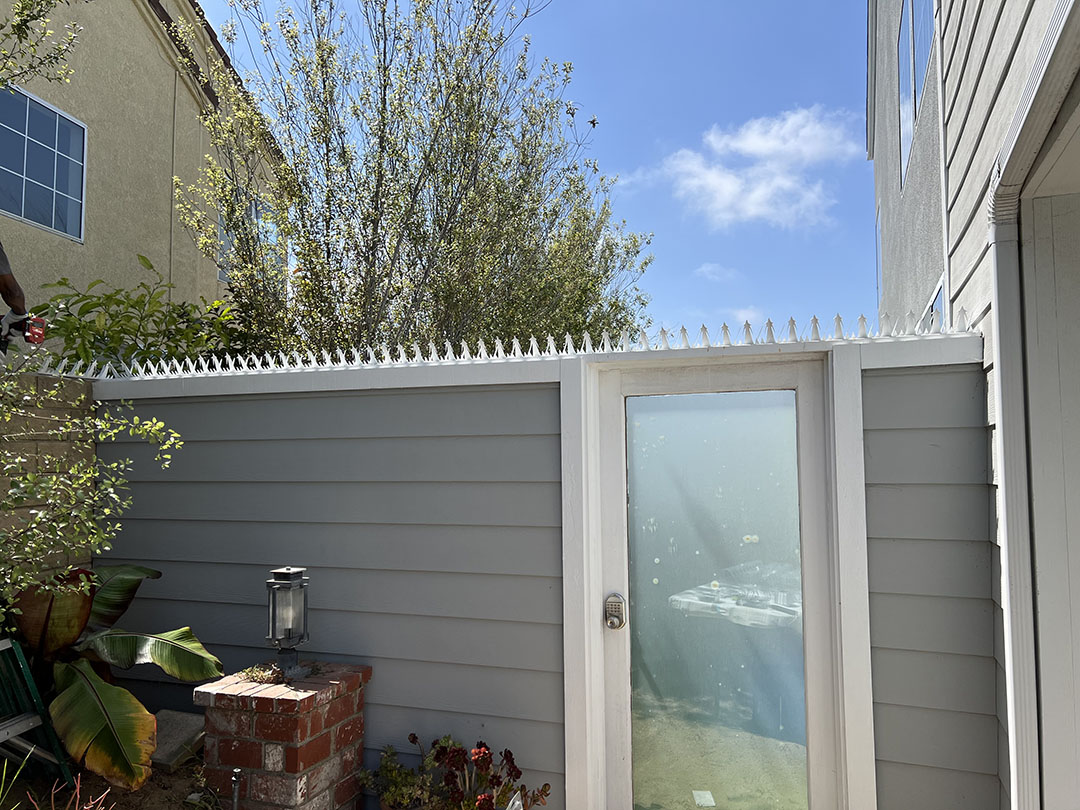 Tightened up the security to get in my backyard. The wife pointed out that all someone had to do was climb up on the lamp and then up and over the wall, I think this should help that. Got galvanized 12 inch sections from AM then painted with white rustolum. Better than razor ribbon and the parts even come with gloves, so you do not get cut.