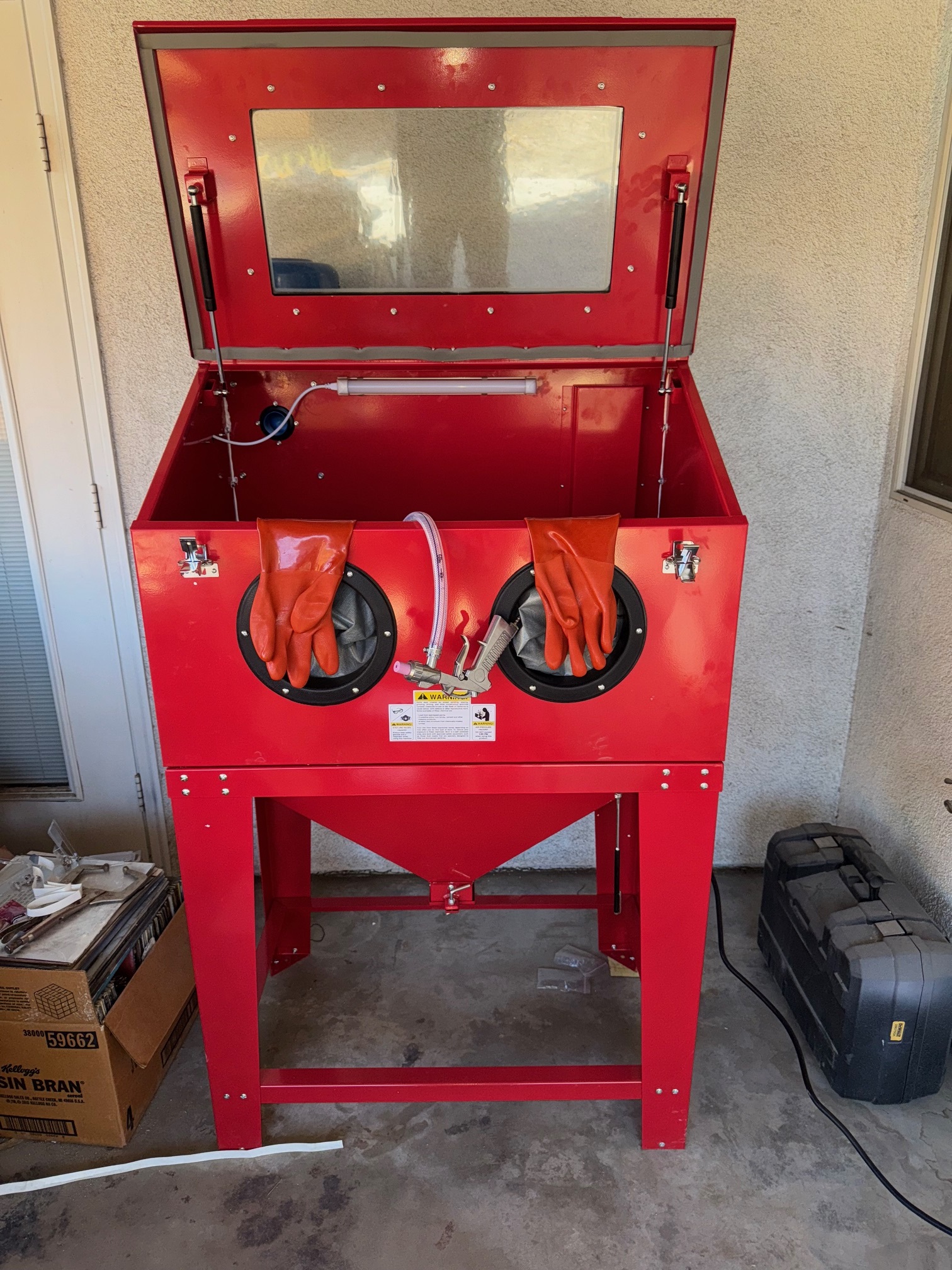 it is the beginning of the season here, so time to work outside. Engine /trans comes out then all the suspension. I have been dreading this because everything needs to be stripped for paint, and my hands hurt. With hundreds of sanding hours ahead I was surfing the web and came across an ad for a blast cabinet. $214.00 was the price with a gun on Temu. Ok must be tiny right, no, not really. 33" wide top loader that would fit a trailing arm and most everything else. I could not buy the metal to make it for that sooo:
