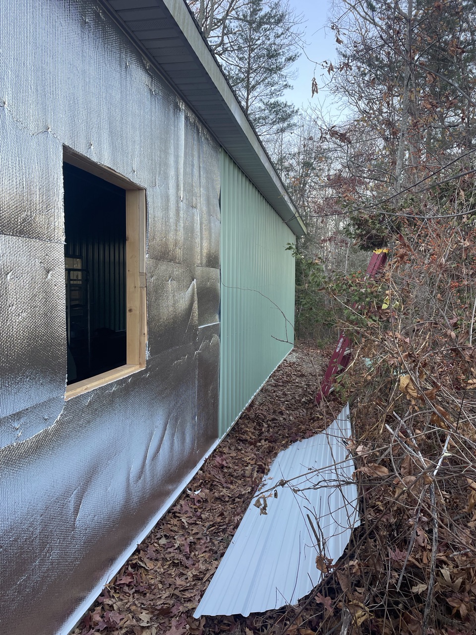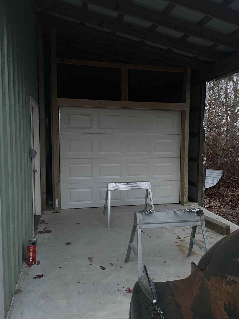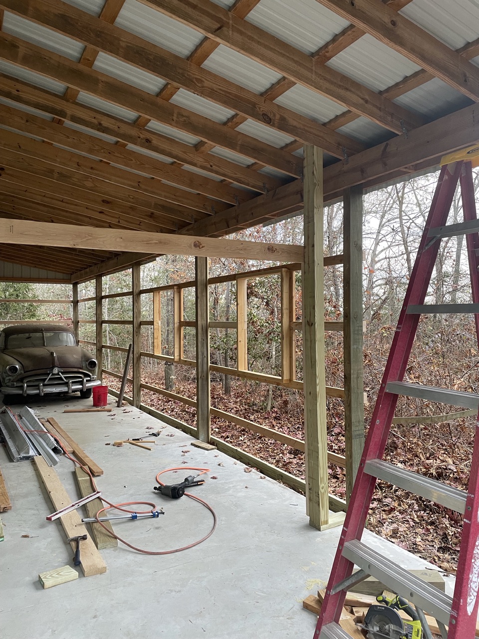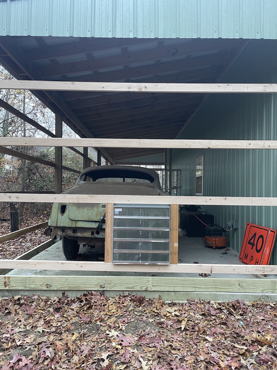 Haven’t had the 914 out in a couple weeks now. I’ve been busy adding another 12x40 area to my shop. My shop is 30’ x 50’ and had a full length lean-to on one side. I’m enclosing the rear 40’ of the lean-to so I can have a clean place to park the 914 while working on my next project. The rear section will also serve as a paint booth when needed. To that end, I installed an exhaust fan at the bottom of the rear wall.