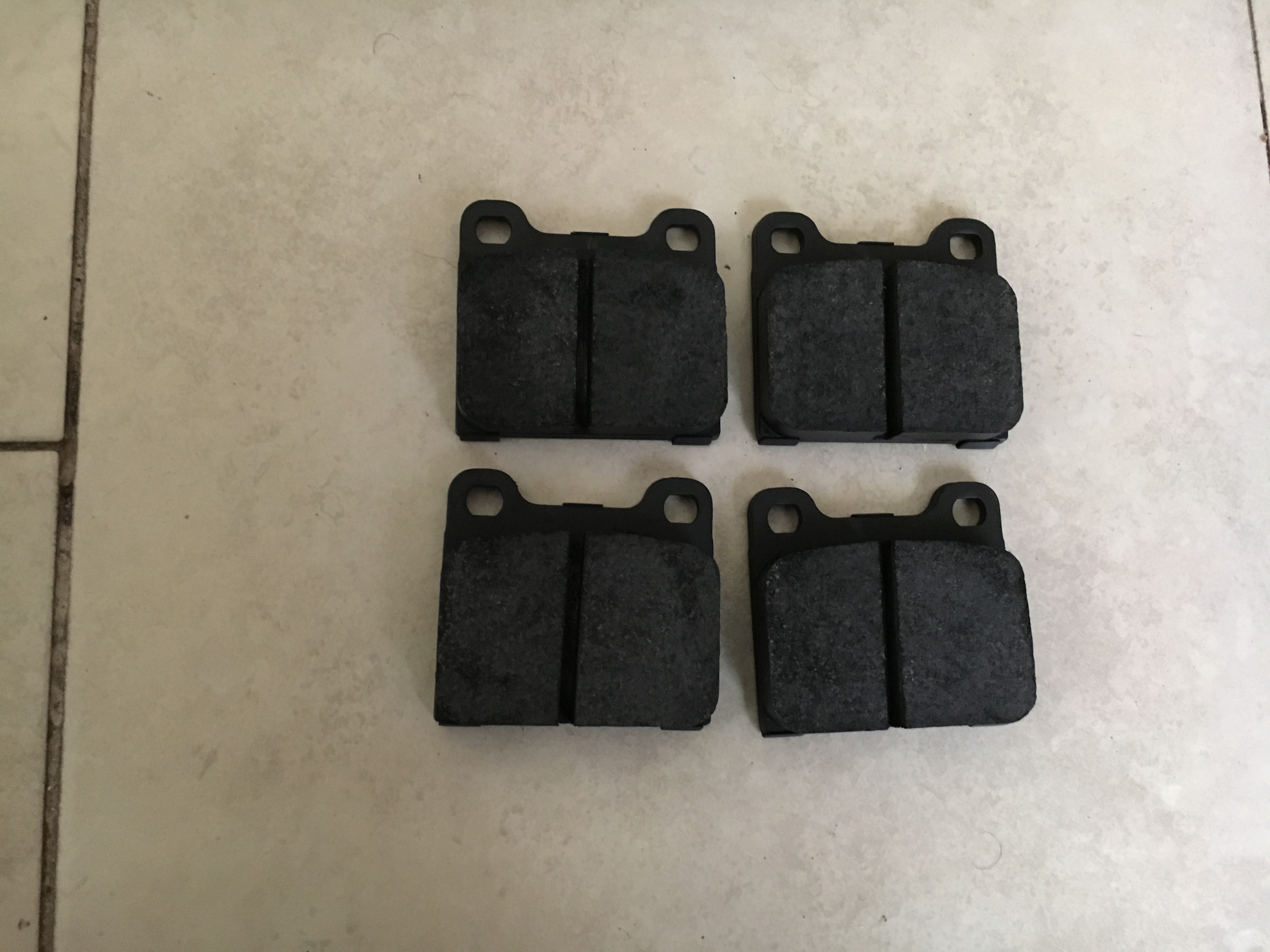 Rear pads will be slightly smaller & have a different sized (asymmetric) holes on each pad corresponding with the securing pins
