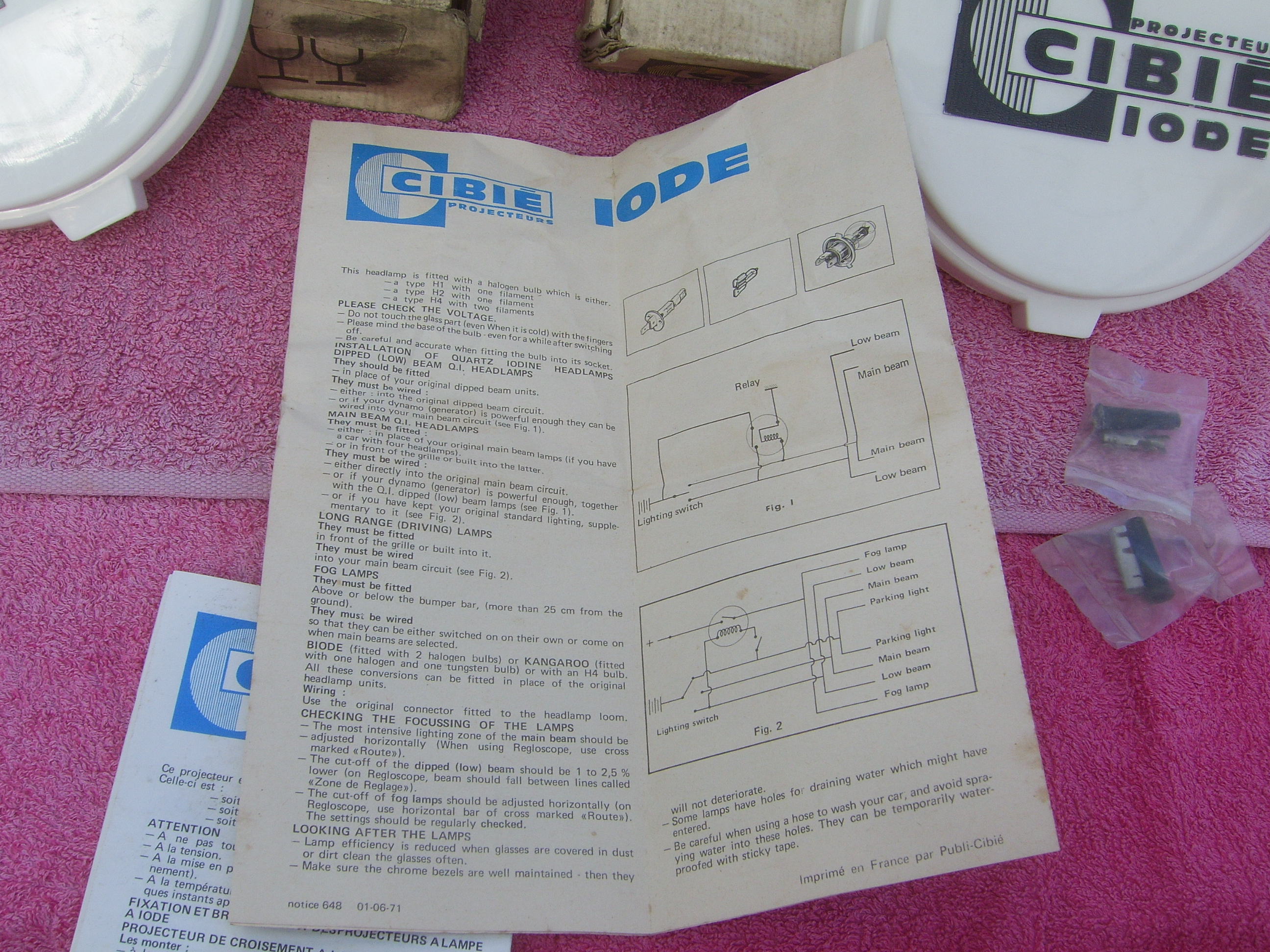 FS: A set very rare 7" NOS Cibie 45 Iode yellow driving lights with clear lenses and a set NOS covers. Included are the Original boxes (bad condition) and mountinginstructions date code Jun '71. Bulbs are included, lights are working. Price 235 euro + shipping.