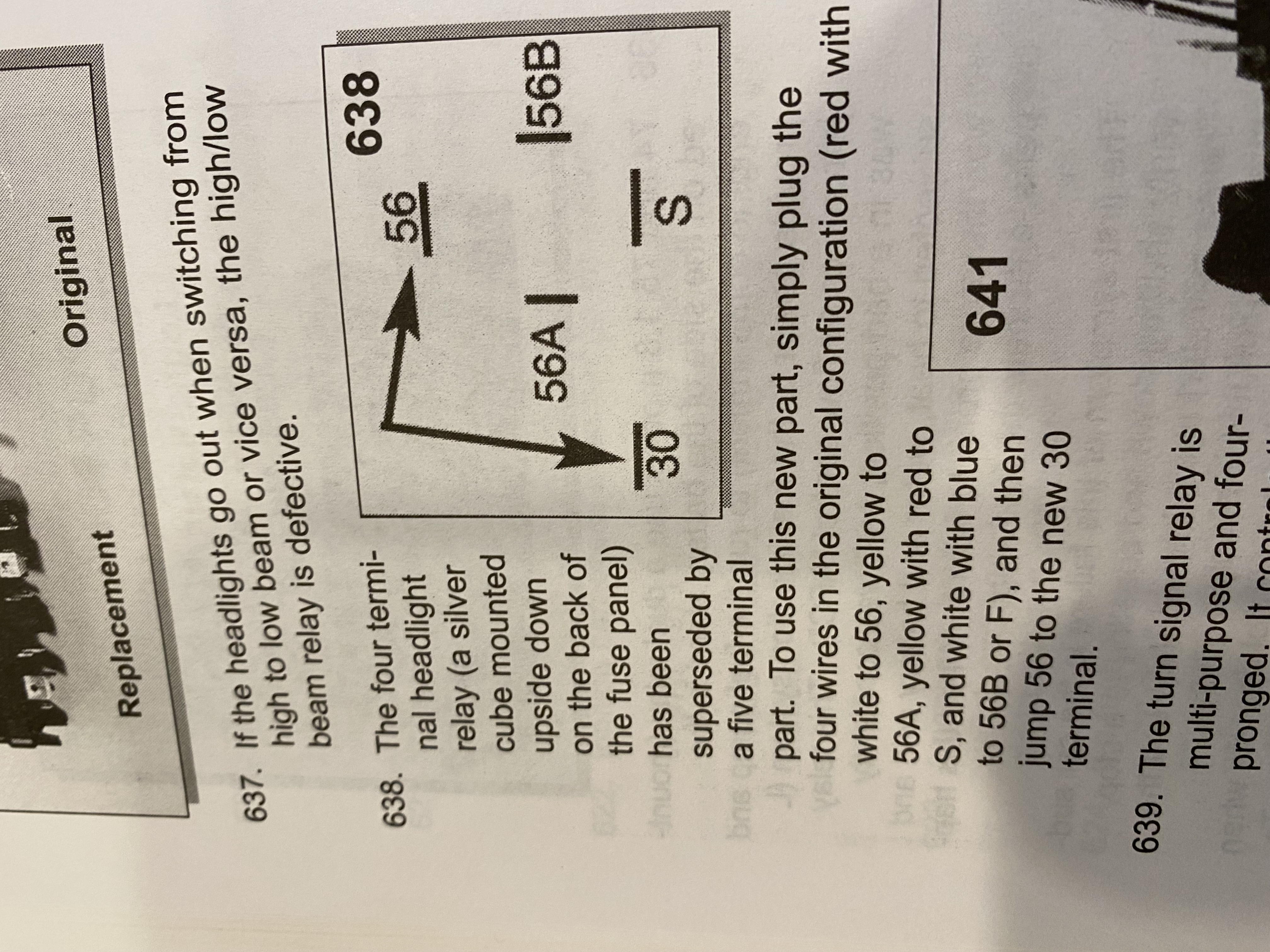 THis is the missing piece i needed.... "According to Dr Porsche's 914'S,TIPS PAGE 105: The 4 term headlight relay has neen replaced by a 5 terminal part. To use this new part, plug the four wires in the orig config, red / white to 56, yellow to 56A, yellow / red to S and white/blue to 56B or F and then jump 56 to the new 30" And I have the TIPS book too. Never would have thought to look there. (IMG:style_emoticons/default/confused24.gif) Thanks, Clark |