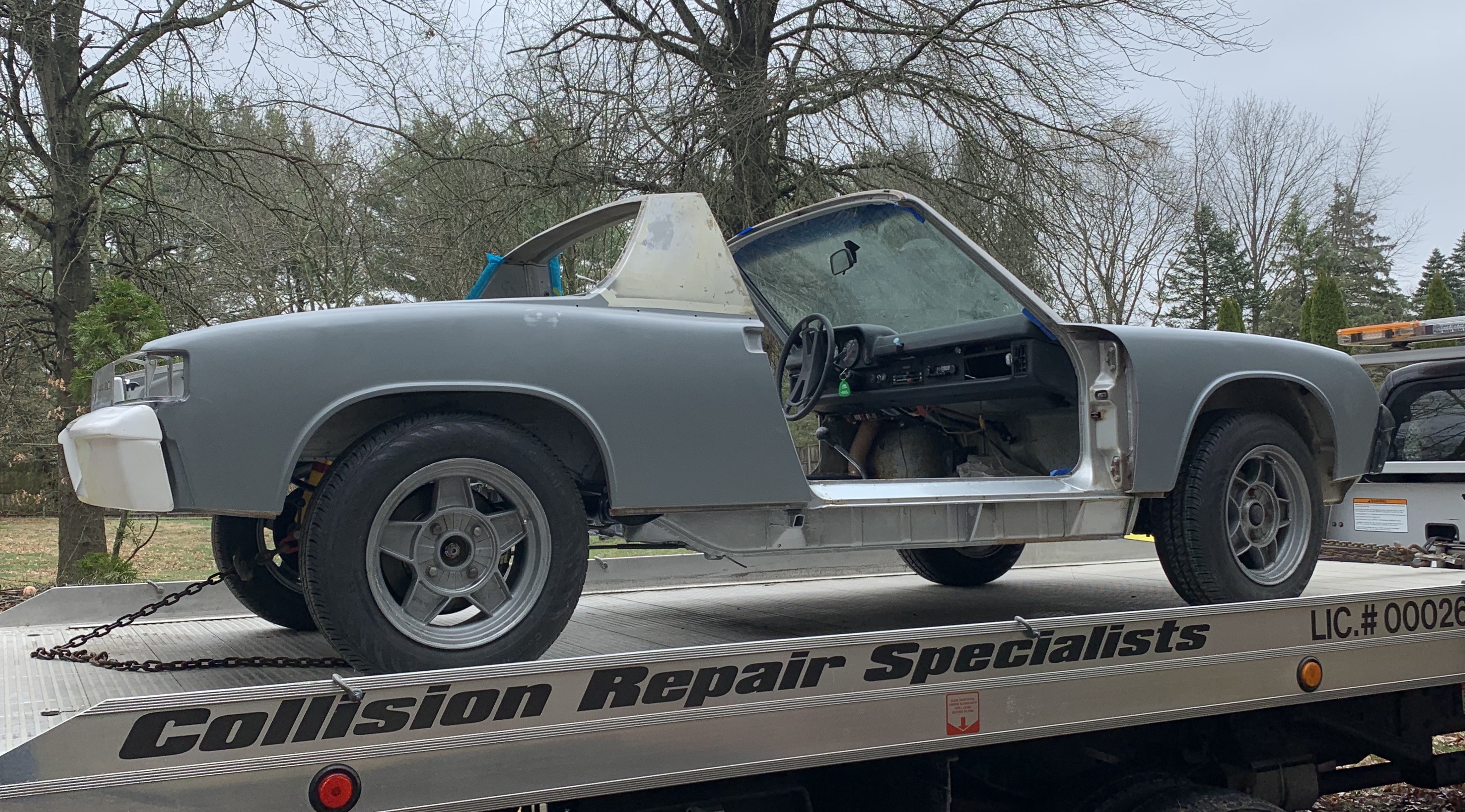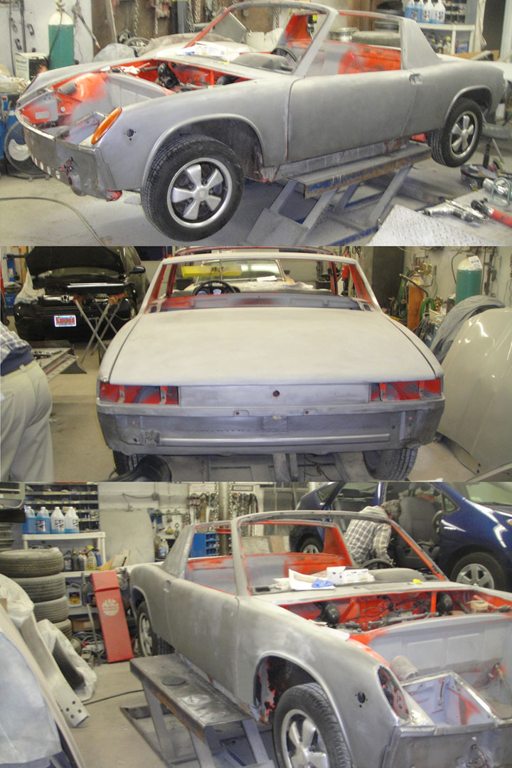 I just painted my 76 back the original Magala Red. It is a SoCal one owner car, always garaged, zero rust or even a hint of rust anywhere including the hell hole and battery tray. The jambs and inside trunks were very nice. I did the body work, the high build primer coats, and all the sanding including the final sand prior to sealer and color. The car was pretty well disassembled. Windshield and rear window glass were left in, but that's about it. Doors disassembled, rockers, all trim, lights, headlight doors, etc. The hood, rear trunk lid, engine lid, and headlight doors were painted off the car, There is no way (IMHO) that you can get around the three big panels and still keep the gun the same distance from the surface without removing them from the car. No need to build stands. Use sawhorses. Here's a video of my buddy Paul applying the sealer and color... Painting the 914 This is a single stage paint. I see no reason to go to bare metal (IMHO) if the car is in original paint ONLY and if it is in good condition other than fading. It's like having one more primer coat to block out. If you find some problems when you block out the original, take those sections to bare metal. There will be no problem with paint compatibility since you will be applying multiple coats of catalyzed high build primer and a coat of sealer prior to color. Here's the finished product cut and buffed and reassembled... (IMG:http://www.914world.com/bbs2/uploads_offsite/live.staticflickr.com-20876-1564960619.1.jpg) Here are the jambs and frunk in original paint compared to the respray... (IMG:http://www.914world.com/bbs2/uploads_offsite/live.staticflickr.com-20876-1564960620.2.jpg) (IMG:http://www.914world.com/bbs2/uploads_offsite/live.staticflickr.com-20876-1564960620.3.jpg) Take your time to have your paint supplier carefully match the paint you are going to apply to the body with the jambs or other areas that the sun hasn't weathered. |