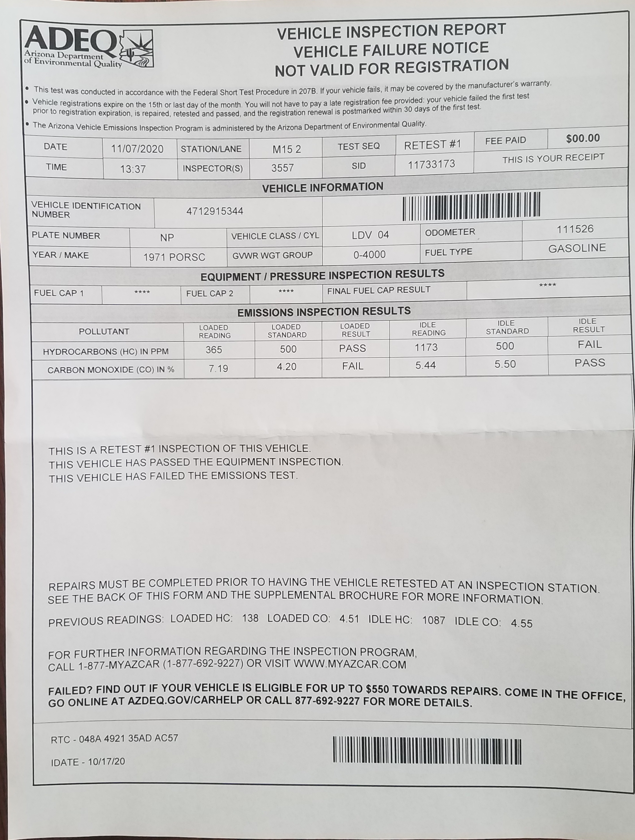 Our time at the Arizona emissions testing station was not as much fun. The car failed (again). (IMG:style_emoticons/default/hissyfit.gif) 1.8 liter with dual Webers AFAIK it is stock other than the Webers. Stock cam, stock pistons, etc. It is at factory specs, idles at 900 and the timing is at 7.5. The test report has the numbers from the previous test listed at the bottom. I'd like to think I can get it to pass with just an adjustment to the timing. Any suggestions on what I need to do to get it to pass? Attached thumbnail(s) |