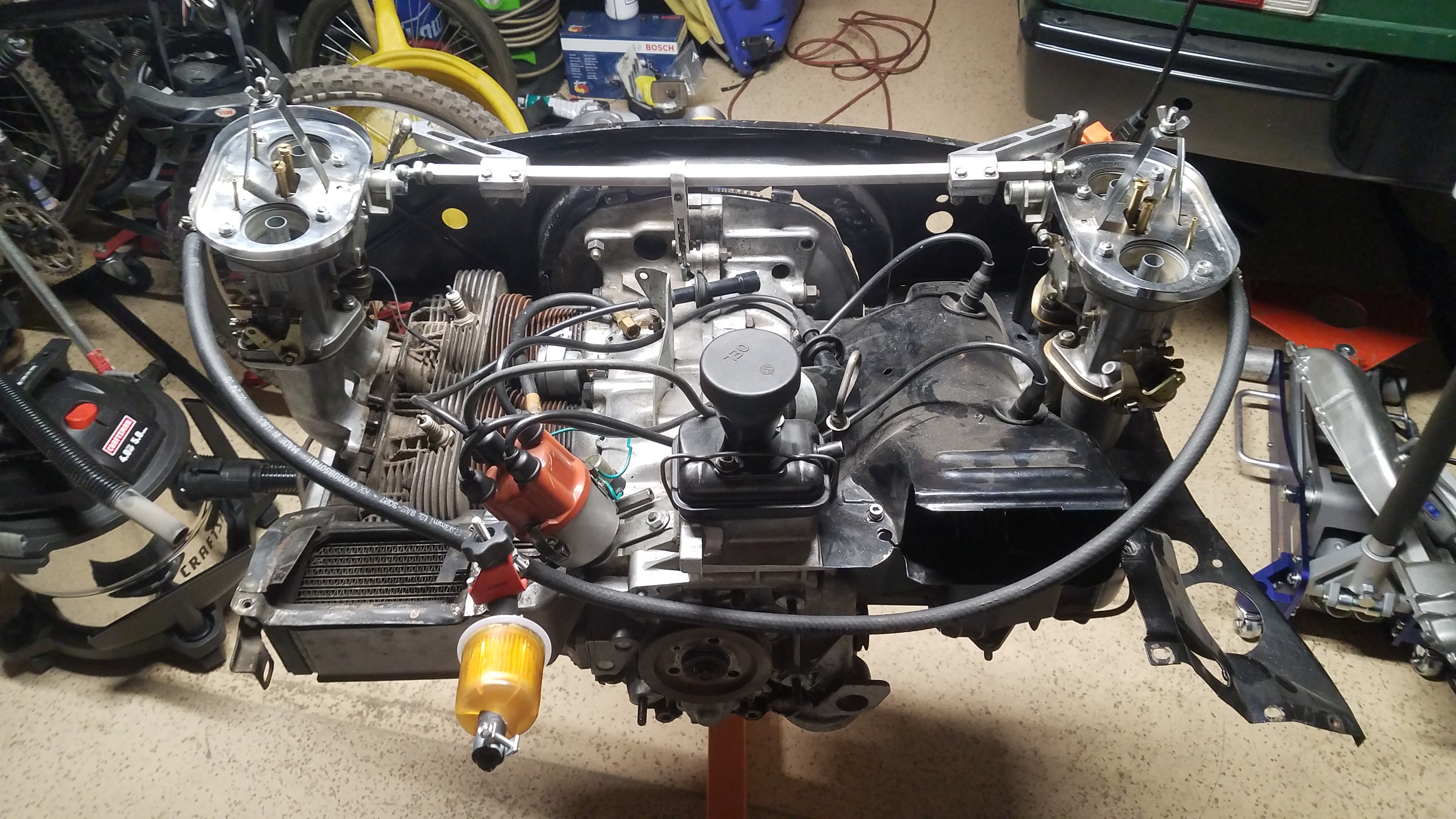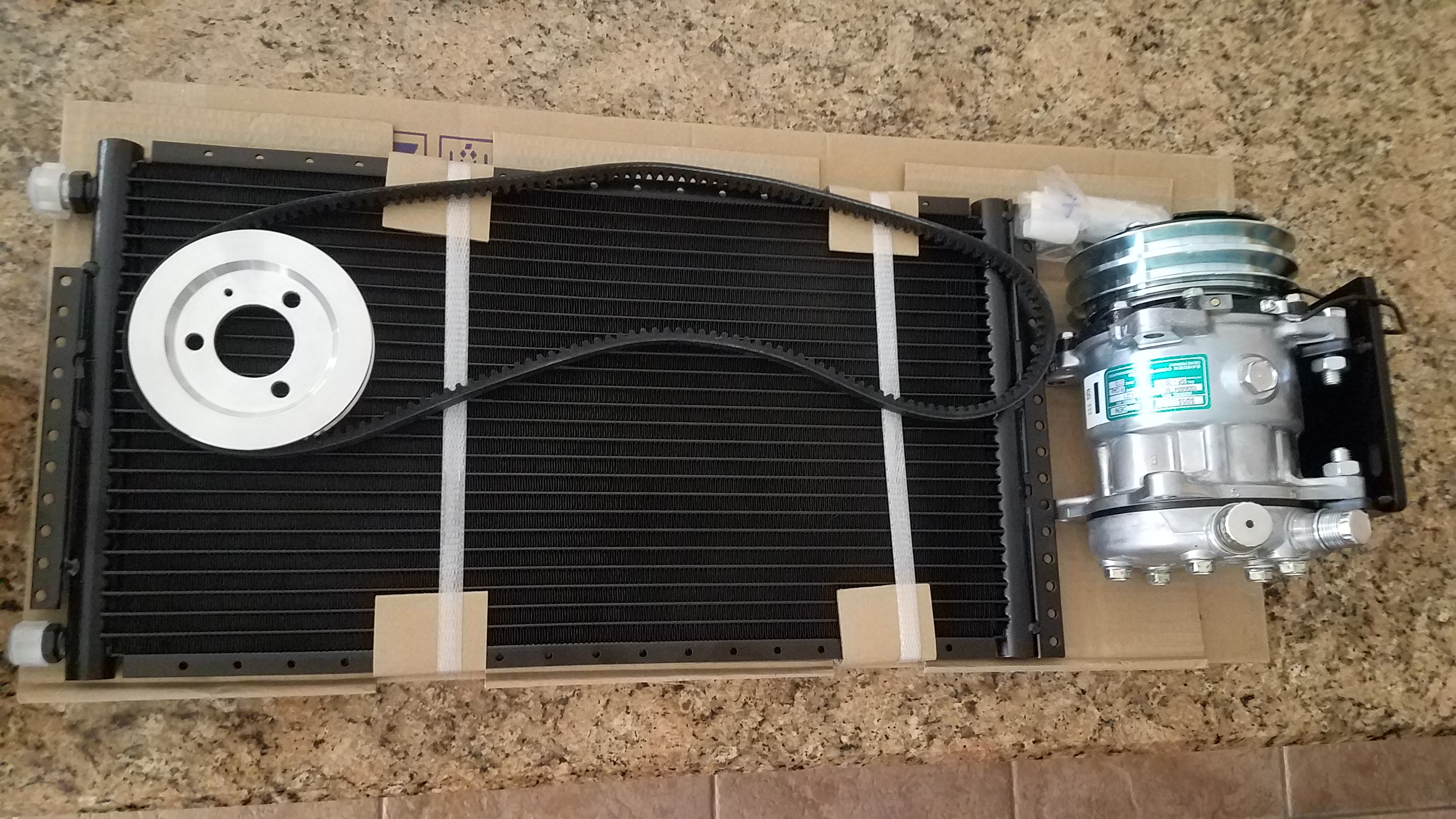 Then he noticed that it was marking it's territory a little too much so it returned to the garage. Nathan wasn't too disappointed. He LOVED college and didn't have much need to leave campus so the 914 was sitting most of the time. He is now back at home for the summer and we are dropping the engine and trans to fix some oil leaks this weekend. To go with fixing the oil leaks, we have been on a buying spree for AC parts(driving in Phoenix in the summer without AC is brutal). We are building a custom AC system using an original under dash controller/evaporator unit with a new Sanden sd5h11 6333 compressor and a 11" X 21" parallel flow condenser mounted to the engine lid with dual high flow/low profile 10" fans. The condenser is bigger that the factory condenser on my 1990 944 Cab. I will be using R-134 and I am hoping the more efficient condenser design and larger size will offset the inefficiency of using R-134. The biggest challenge was finding a mounting bracket for the compressor. I found a supplier out of Singapore that listed a top mount for a type 1 engine but no one had a mount bracket for a type four on any website I could find. I've read somewhere here on 914world that Ed at gilmore-enterprises.net was building a 914 kit but when I checked his website, no dice. The website did say to call if you have questions or want info about custom or future kits, etc so I called and Ed hooked me up with a mounting bracket and a pulley and all the mounting hardware. There is a shop in Phoenix that specializes in rebuilding old AC lines and building custom AC lines. I am debating the merits of having them make the lines vs buying a crimper and doing it myself. |