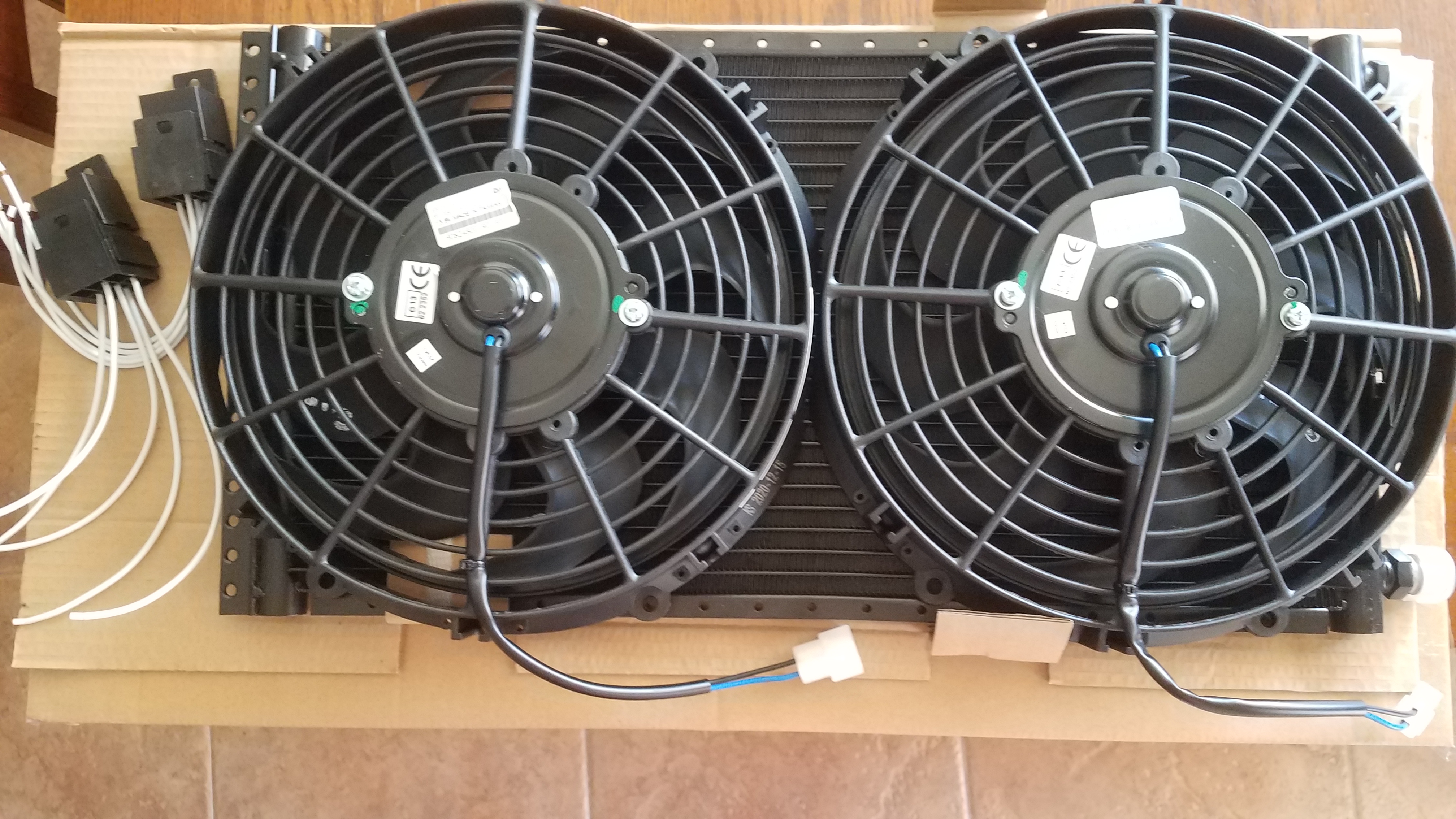 The angle of the picture is deceptive. The fans hang off both ends by about 1/8 th of an inch. There is very little wasted fan space and uncovered condenser space. This will be mounted to the underside of a GT style engine lid. If I get creative I could set this up to pull air into the engine compartment or push air out. What is the normal airflow direction through the engine lid. I don't want to fight against the normal airflow. |