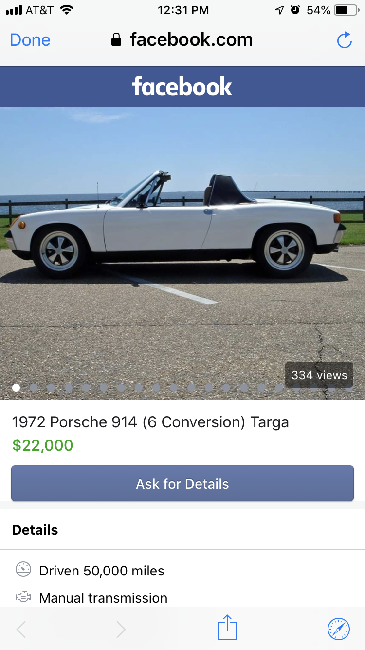 Only 1 youtube video on the account. Maybe just to share the cool drive for interested buyer. Seller from Louisiana and check facebook page under his video for the details about the car. Looks really nice and price seems good for $22k. 1972 1.7 to 2.7 engine. https://youtu.be/uxIi72K8wx0 facebook url: https://m.facebook.com/marketplace/item/930472423968196/ |