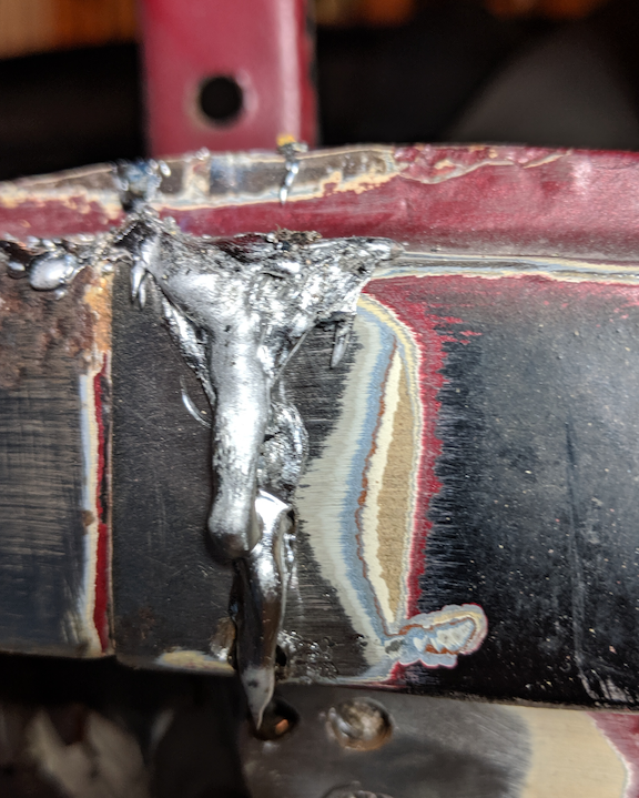 When I hit the top corners of the panel where the trunk channel ends with the torch, after the paint came off I was shocked when a mystery substance started melting out of the channel, running down and dripping onto the floor. It was bright and silver and was a lot like, if not exactly like, solder. It was on both sides, so I presume this was a factory thing, but I've never seen anything like it. Does anyone know what it is, what it's for and why it is there in the first place? BTW - Still no luck finding where the rear panel detaches at its top! I've included a picture of what it looked like when it dripped and cooled: (IMG:http://www.914world.com/bbs2/uploads_offsite/i.imgur.com-22543-1570150884.1.png) |
