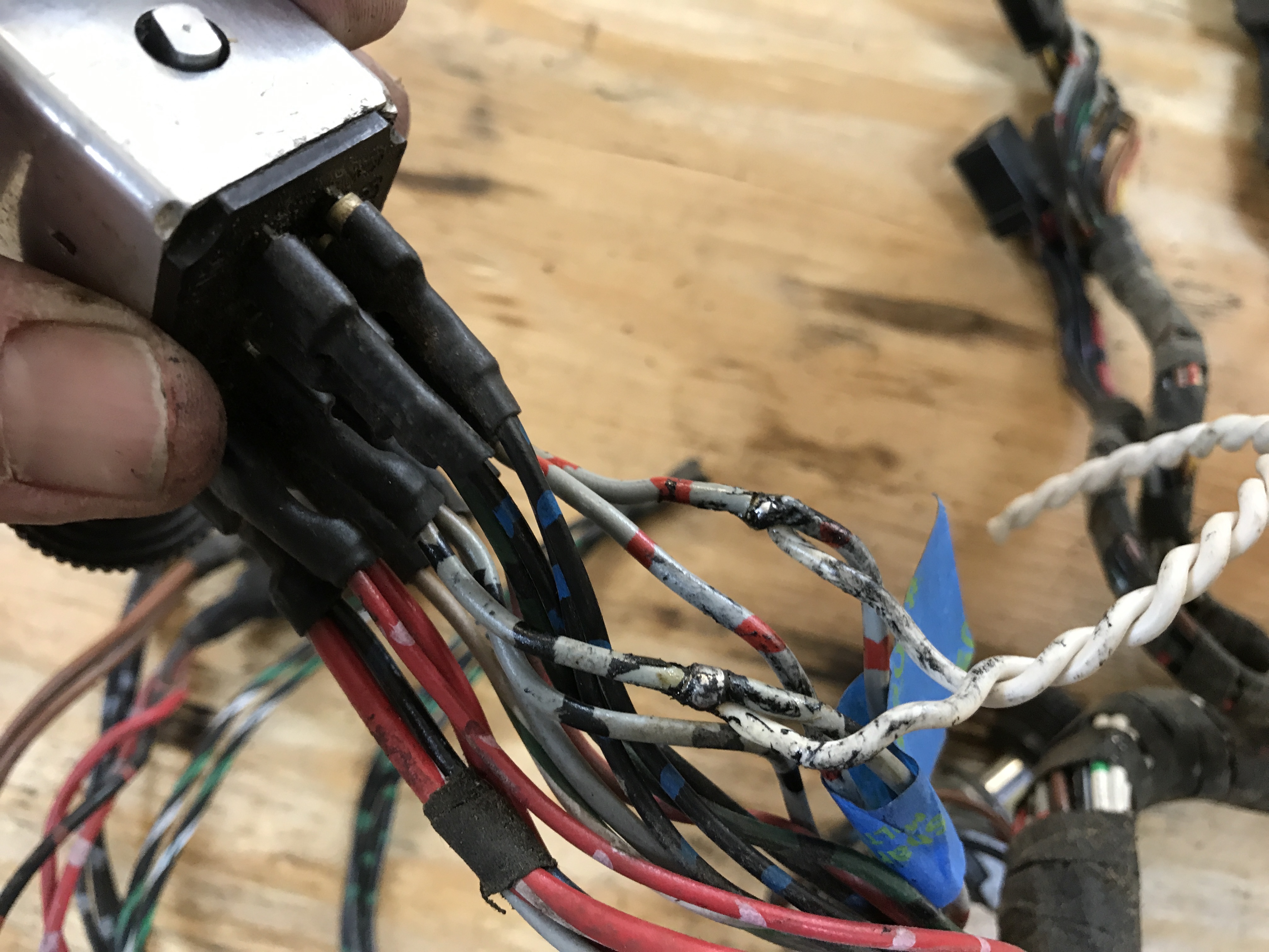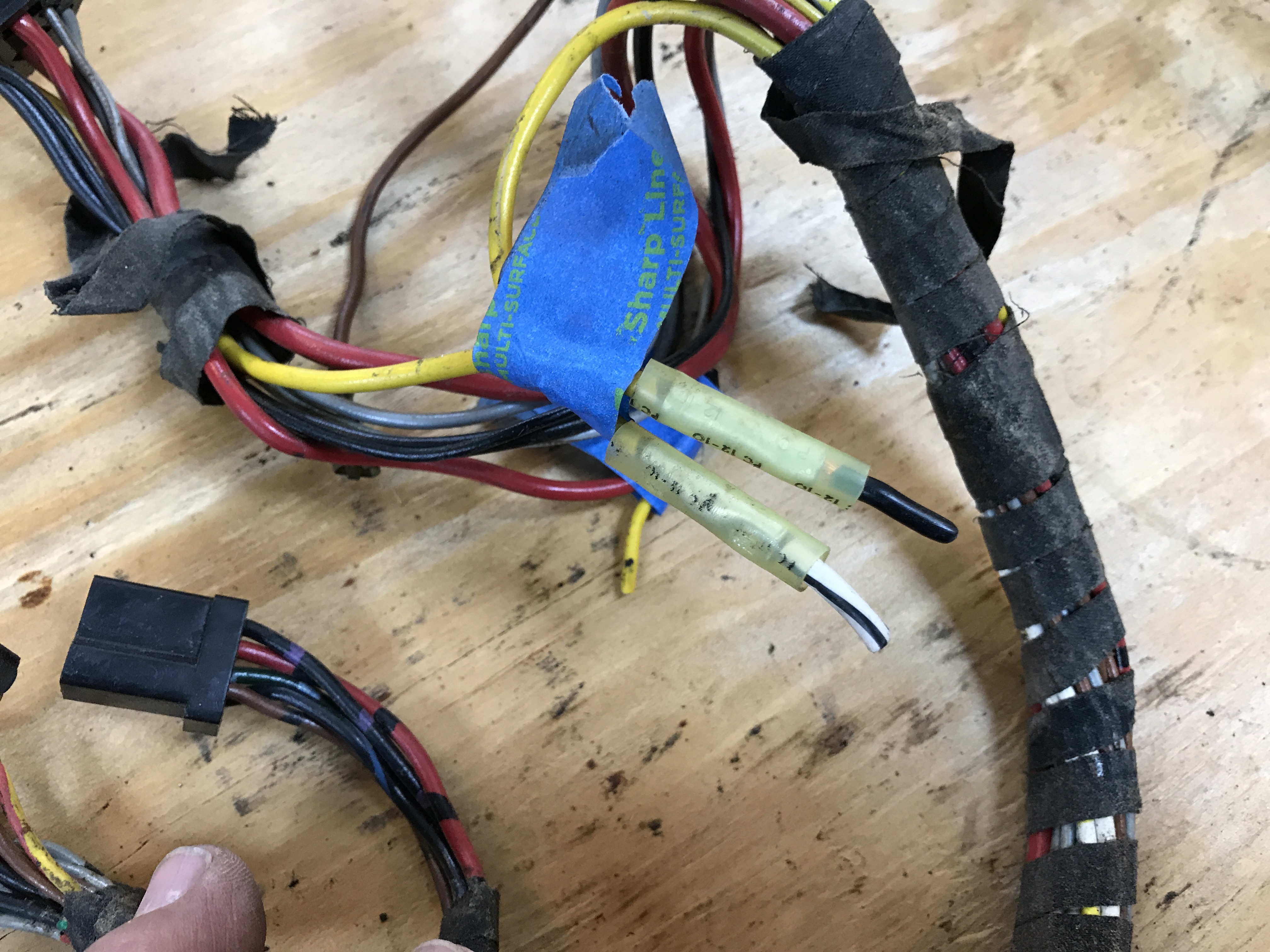 More careful diagnosis of the main harness today. A few problem spots have extra wires spliced in, sometimes soldered...