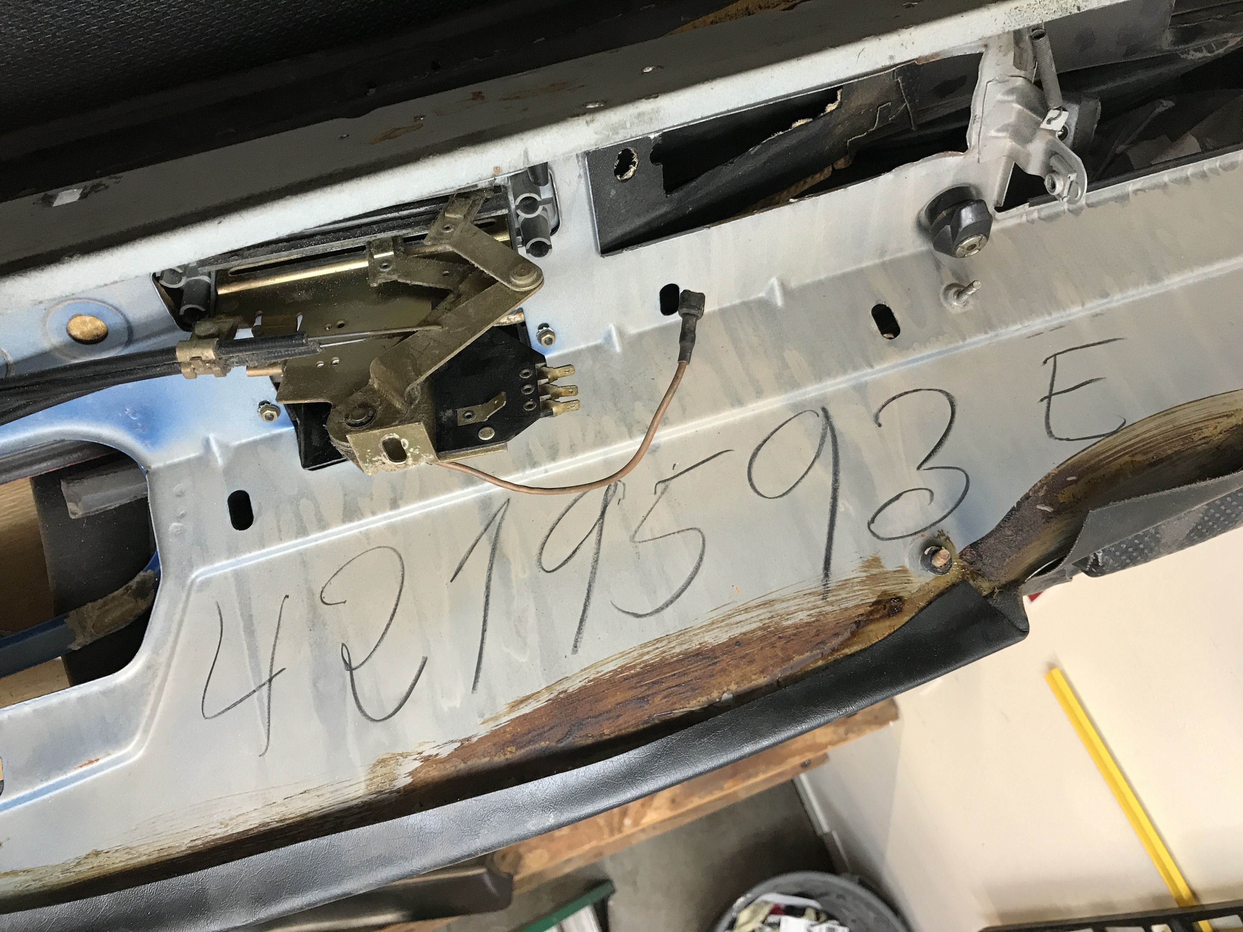 While sorting through the interior parts I rediscovered the hand written number under the dash. This does not match the car VIN, and the blue overspray does not match the original Bahia Red.